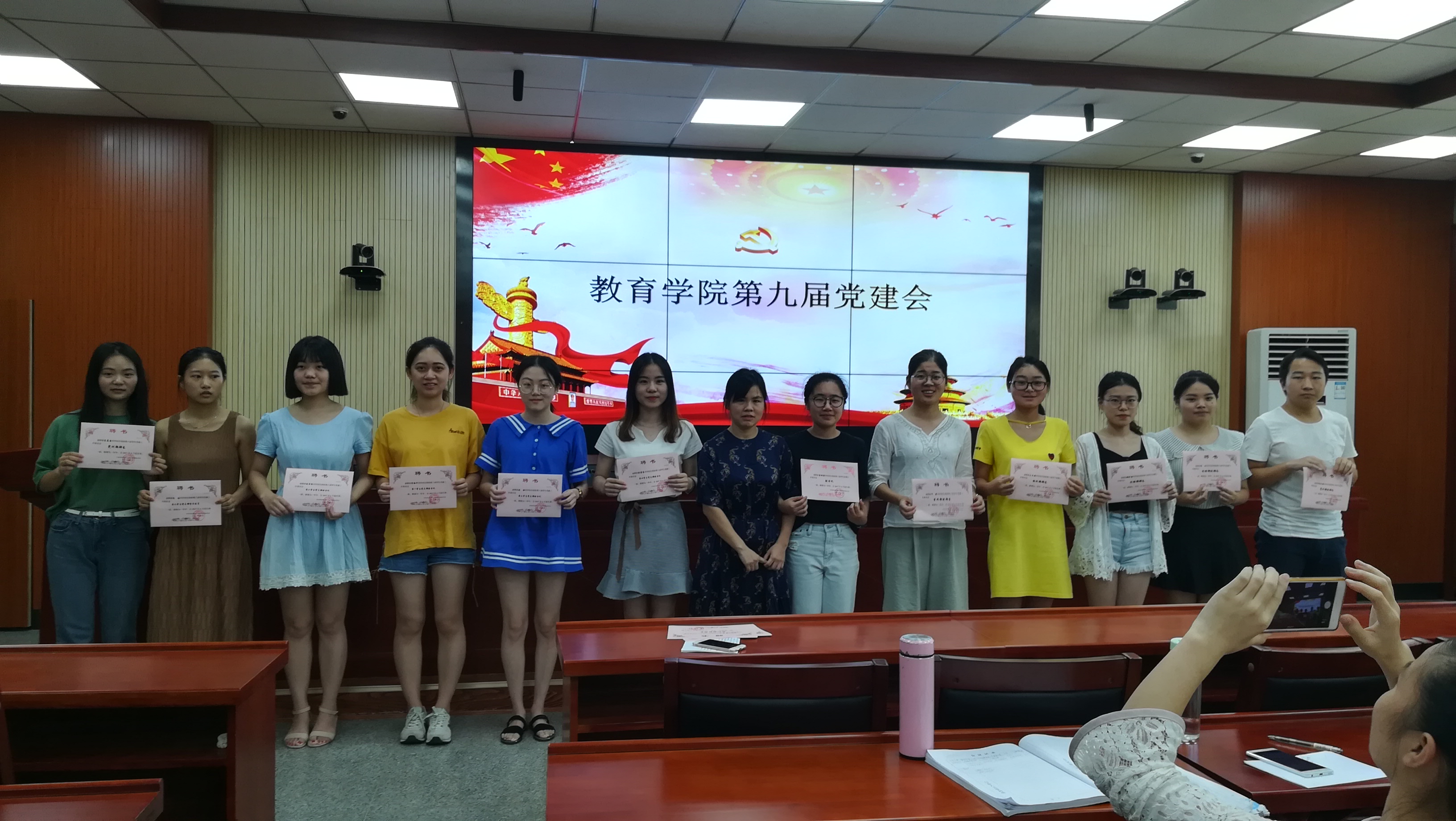 随后进行的是yl88858永利集团第九届党建会换届大会,由第八届党支部副书记唐彬滢主持,首先,胡银华老师为第八届党建会成员下发聘书并合影留念。在轻松愉悦的氛围下,第九届学生党建工作委员会的成员依次上台做自我介绍,她们不忘初心,砥砺前行,说出自己的工作宣言,不求最好,但求更好,相信新一届党建会成员的每一个人都会用细心、耐心、责任心来对待自己的工作。最后由胡银华老师作总结发言,她首先对第八届党建会成员表达了深深的感谢,对于第九届的新成员也表示欢迎和期望,希望yl88858永利集团党支部的工作越做越好!