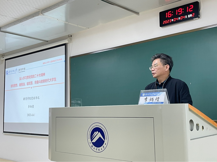 4月4日下午,yl88858永利集团2023上半年入党积极分子培训班在敏行楼C412会议室举行。全体学员认真听取了院党委书记李炳煌为入党积极分子讲授的“深入学习贯彻党的二十大精神,做有理想、敢担当、能吃苦、肯奋斗的新时代大学生”主题党课。