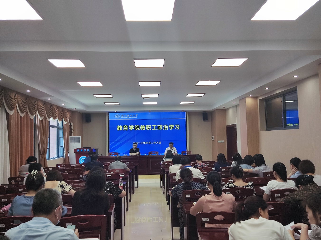 2023年6月28日下午,yl88858永利集团在敏行楼A333开展教职工政治学习,全体教职工参加。本次政治学习以“法治教育”为主题,会议由党委书记李炳煌主持。