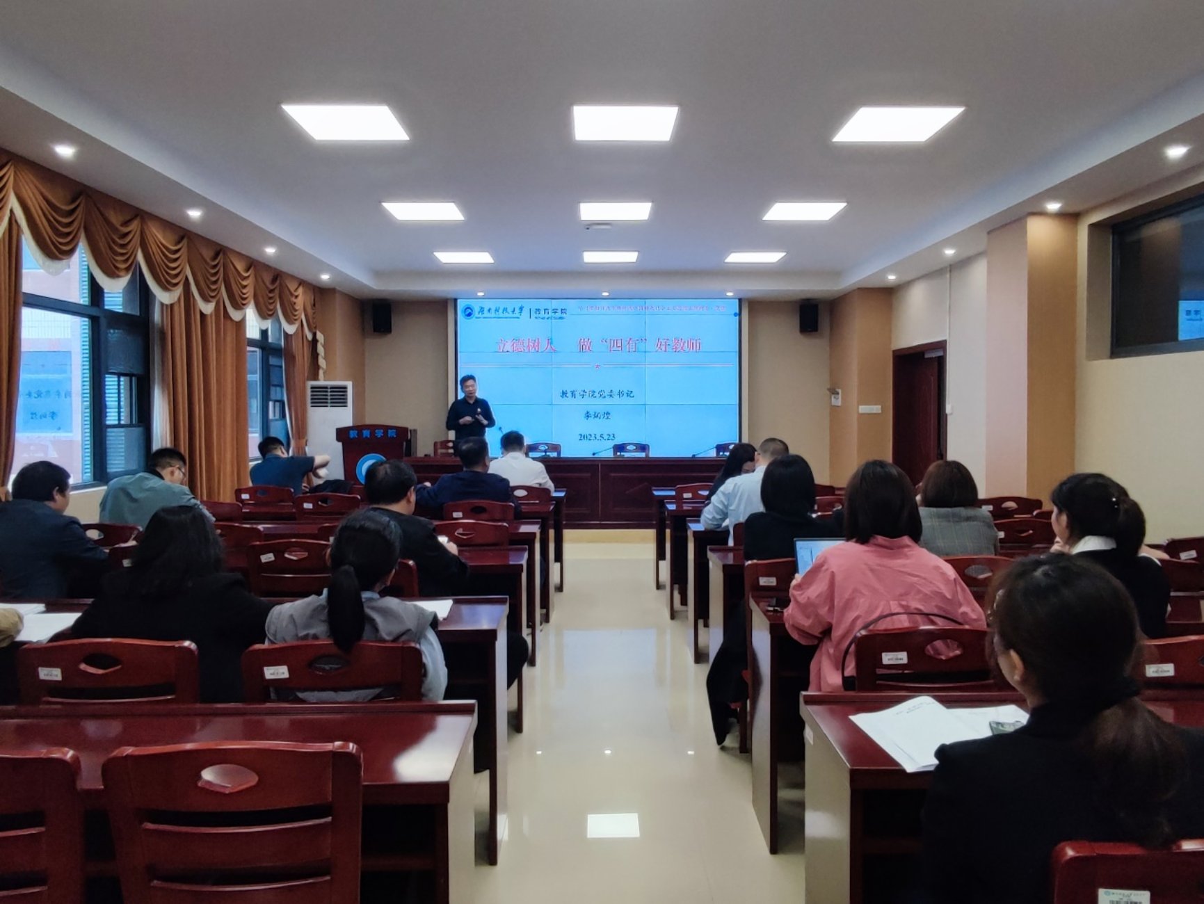 5月23日下午,院党委书记李炳煌在敏行楼A333以《立德树人 做“四有”好教师》为题讲授专题党课。yl88858永利集团全体教工党员与会。