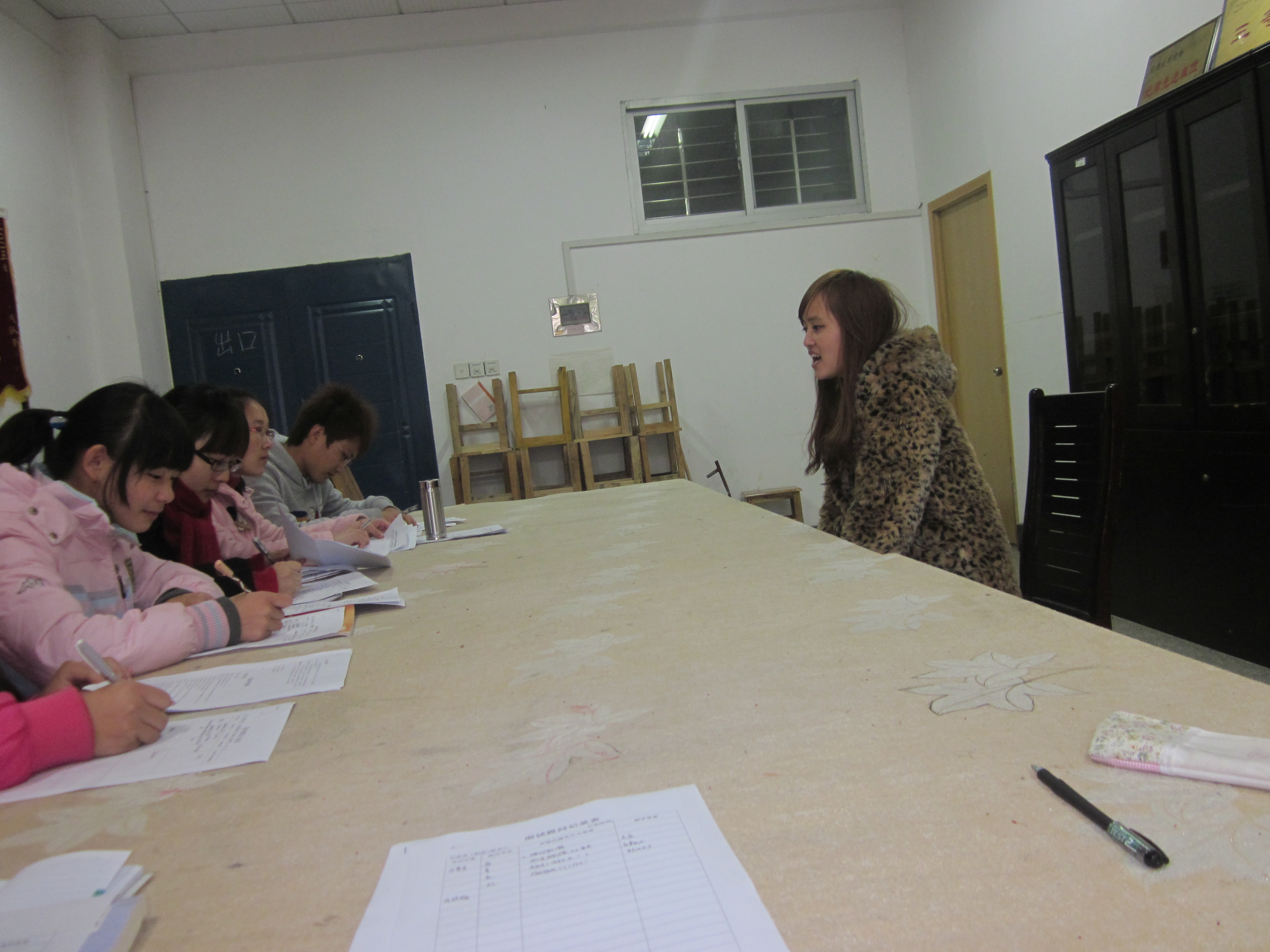 党建会副书记易溪宇,宣传部、组织部、党训部、纪检部各部门部长共5位面试考官,早已准备好面试提纲。静静坐在旁边的观察员和记录员分别由应用心理学两名专业知识较好的党员周维、郑凤娟担任,她们主要负责记录面试信息和维护现场秩序。