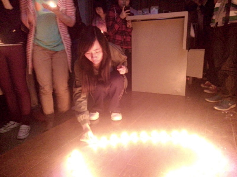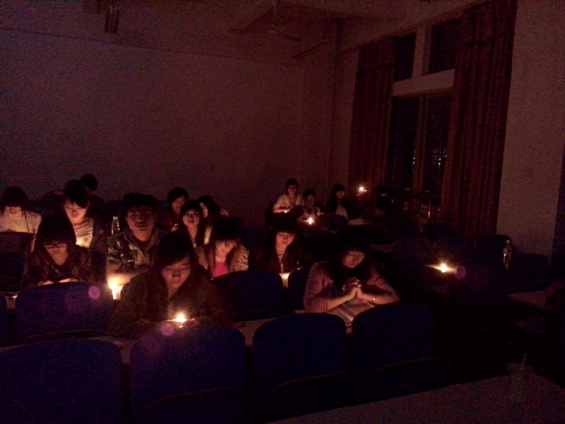 每一个党员同志点亮手中的蜡烛,双手合十,对着烛光,默默的祈祷着。烛光映衬着每一个党员同志的脸,神情严肃而庄穆。接着,在座的党员同志依次上台把心灯摆下,组成一个心形的烛光图案。从跳跃的烛光里,我们仿佛看到了灾区人民的希望。这一盏盏点亮的心灯,传递着希望和祝福……