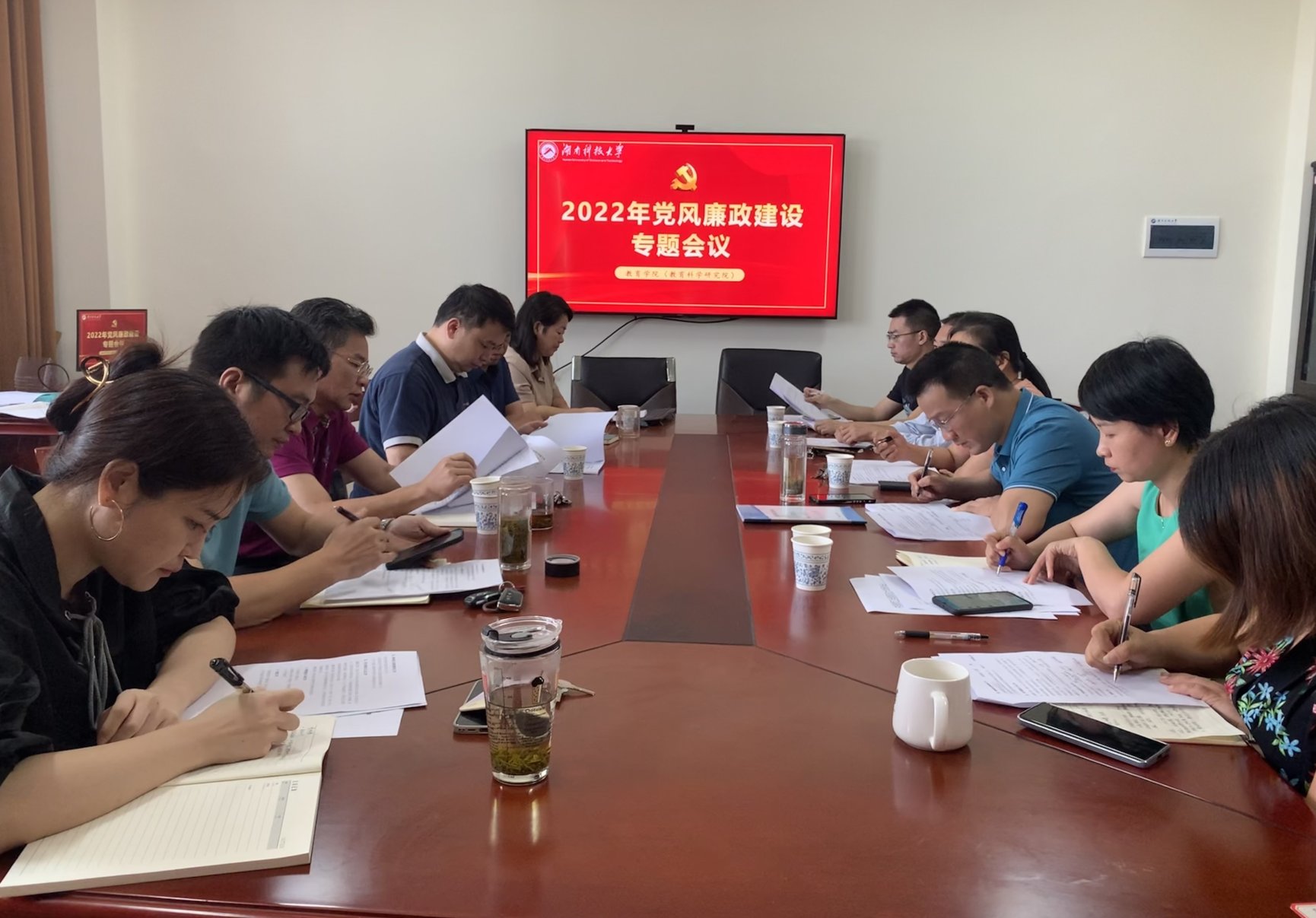 会议传达了党委书记唐亚阳在学校二级党组织委员培训会议上的讲话精神;学习了校纪委书记、省监委驻湖南科技大学监察专员郭时印在《湖南工作》2022年第7期《赓续自我革命精神 推进清廉高校建设》一文。