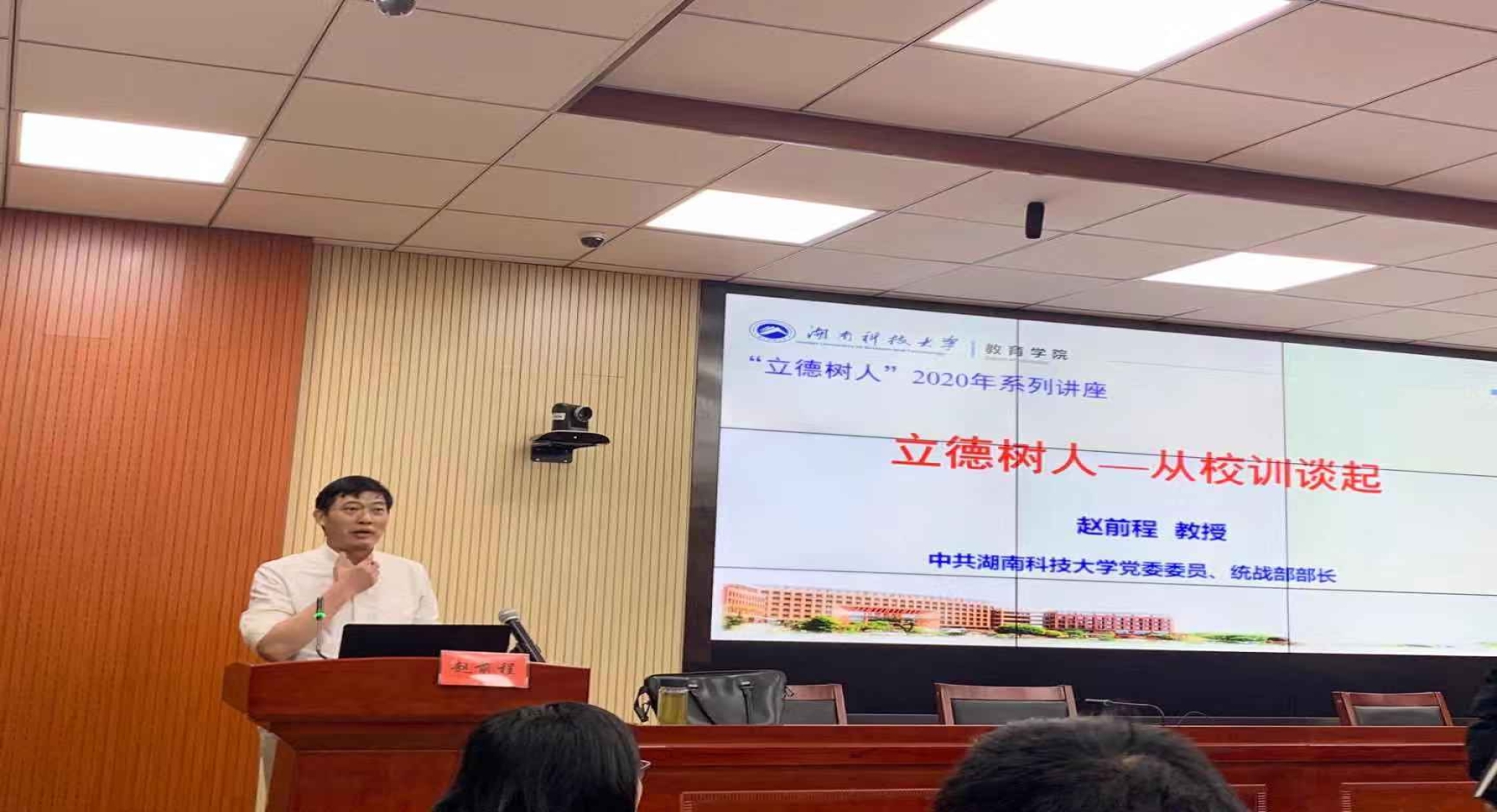 第三阶段,下午2:30在八教308学术报告厅进行。中共湖南科技大学党委委员、统战部部长赵前程教授在八教308为学院党务干部、研究生党员做主题为“‘立德树人’——从校训谈起”的精彩报告。报告由院党委书记李炳煌教授主持。