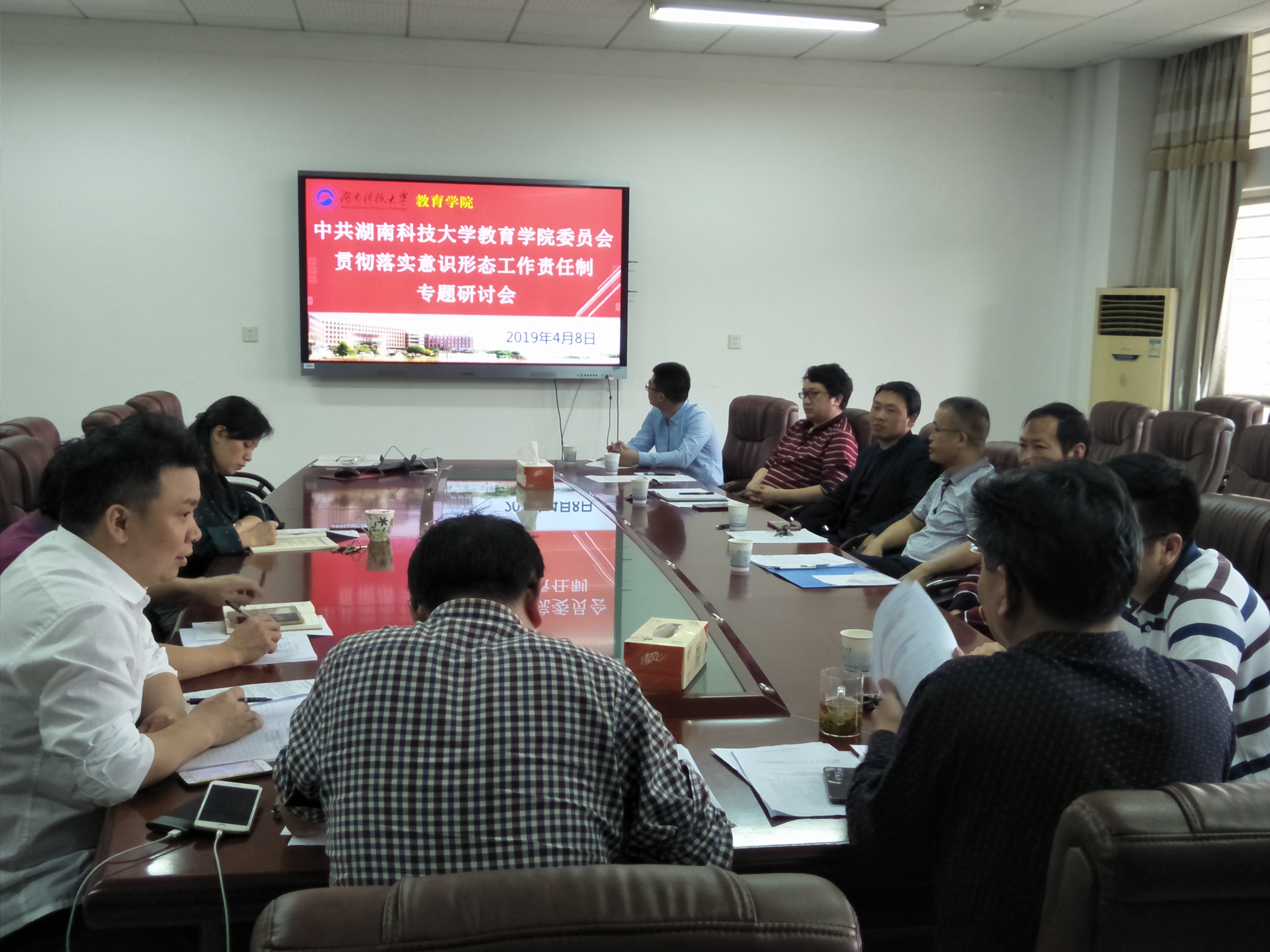 2019年4月8日下午,yl88858永利集团全体党委委员、各教学系系主任、学工办主任、实验中心主任在八教208室召开贯彻落实意识形态工作责任制专题研讨会。会议由院委书记李炳煌主持。