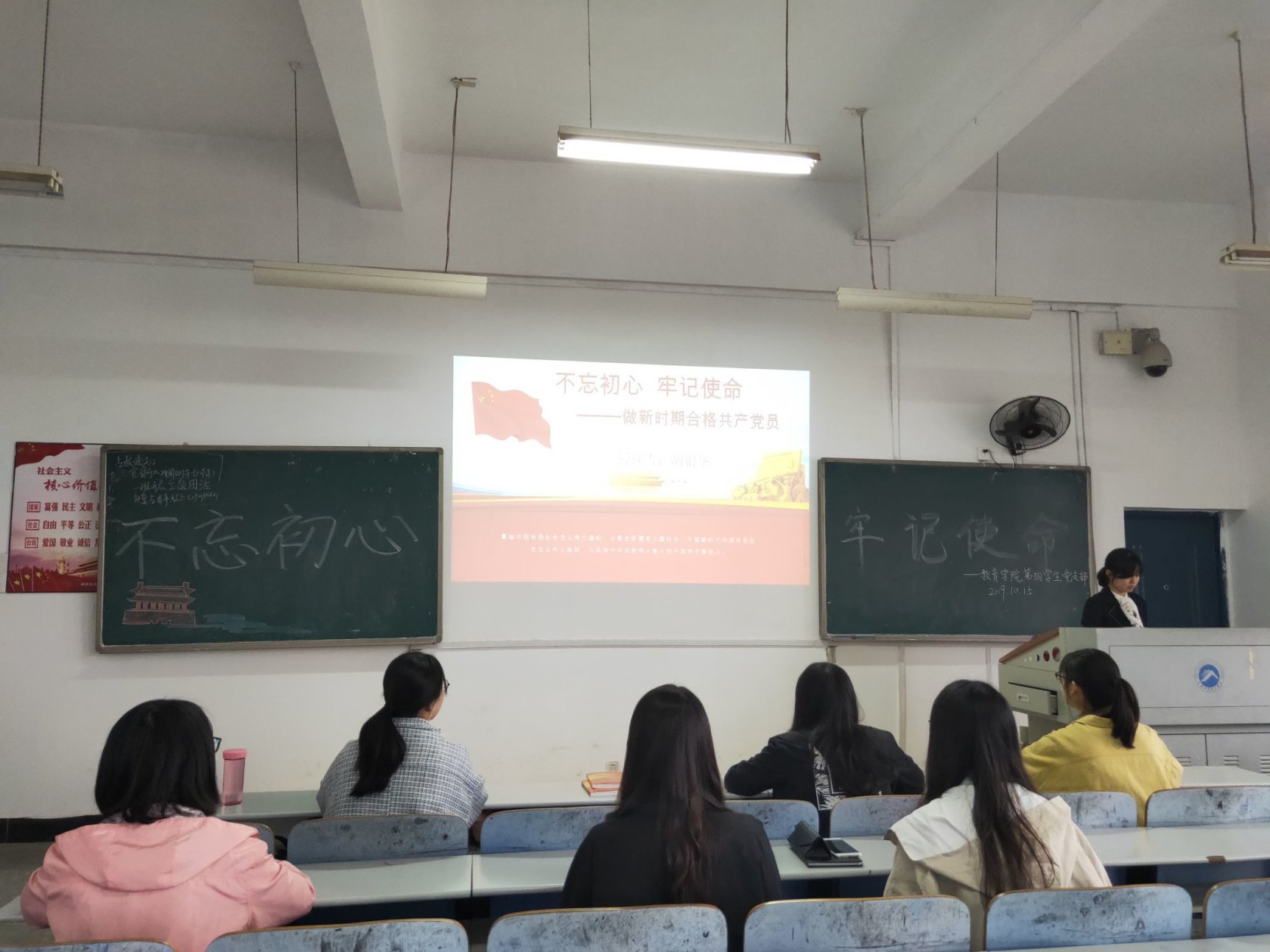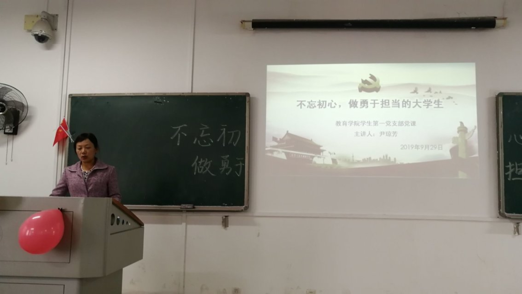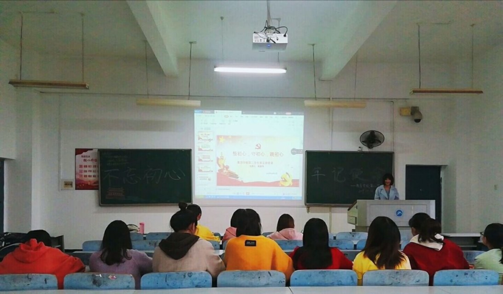 胡银华同志从《中国共产党章程》出发,指出共产党人的初心是,共产党员必须全心全意为人民服务,必须为实现共产主义奋斗终身。并且,她结合社会实际及自我学习认识,向第四学生党支部的学生党员指出,在困境时履行责任与担当是不忘初心,在诱惑面前坚守克己奉公是不忘初心,在灾难时刻做到“我是党员我先上”也是不忘初心,更加直观地促进了学生党员在日常生活中改进工作思路,铭记初心。