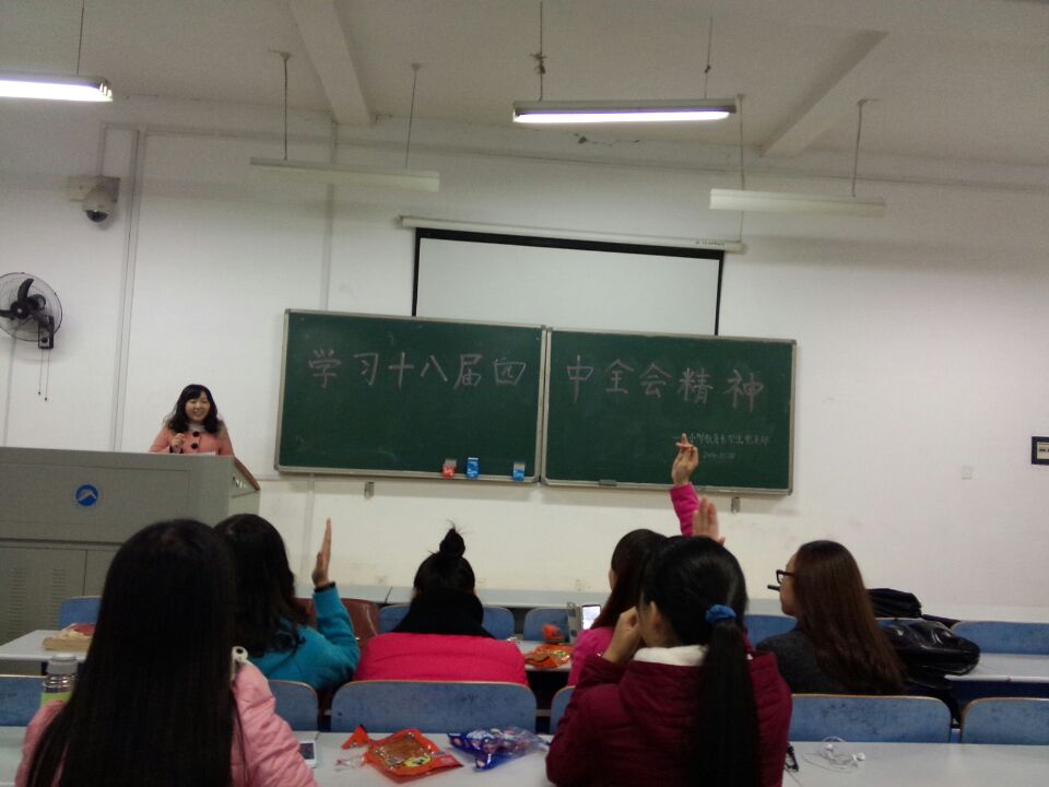 11月27日晚8:00,小学教育系学生党支部在第八教学楼4-1教室召开民主生活会,全体党员认真学习了《中国共产党第十八届中央委员会第四次全体会议公报》和《中共中央关于全面推进依法治国若干重大问题的决定》。