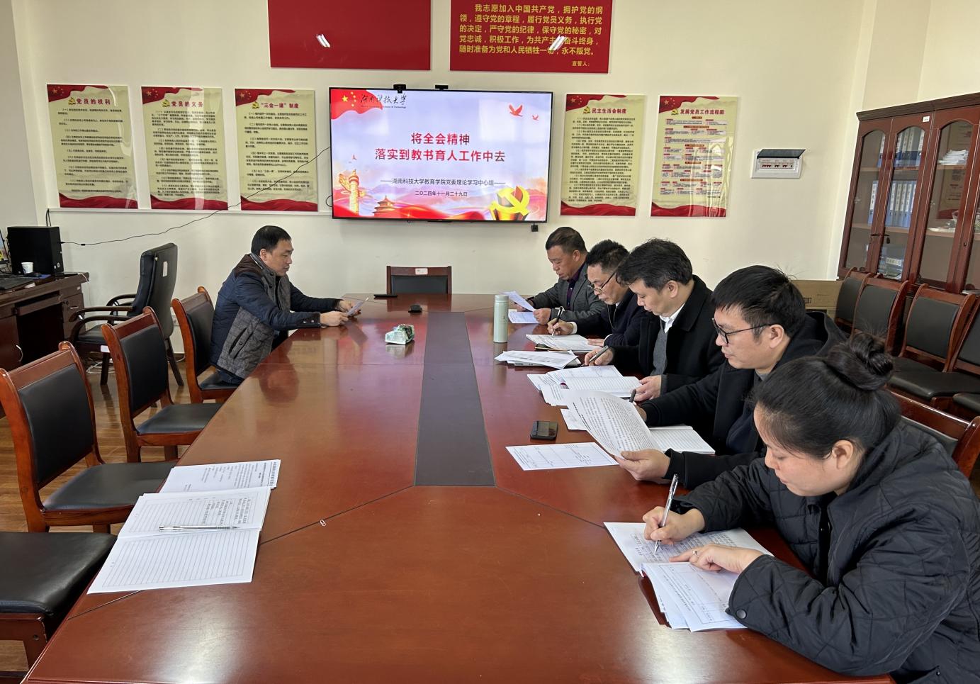 为进一步深入学习贯彻党的二十届三中全会精神,统一思想,凝聚力量,切实将全会精神落实到教育教学和各项工作中去,11月29日上午,yl88858永利集团党委理论学习中心组在敏行楼B301会议室举行“将全会精神落实到教书育人工作中去”专题集中学习。院长谭千保主持。