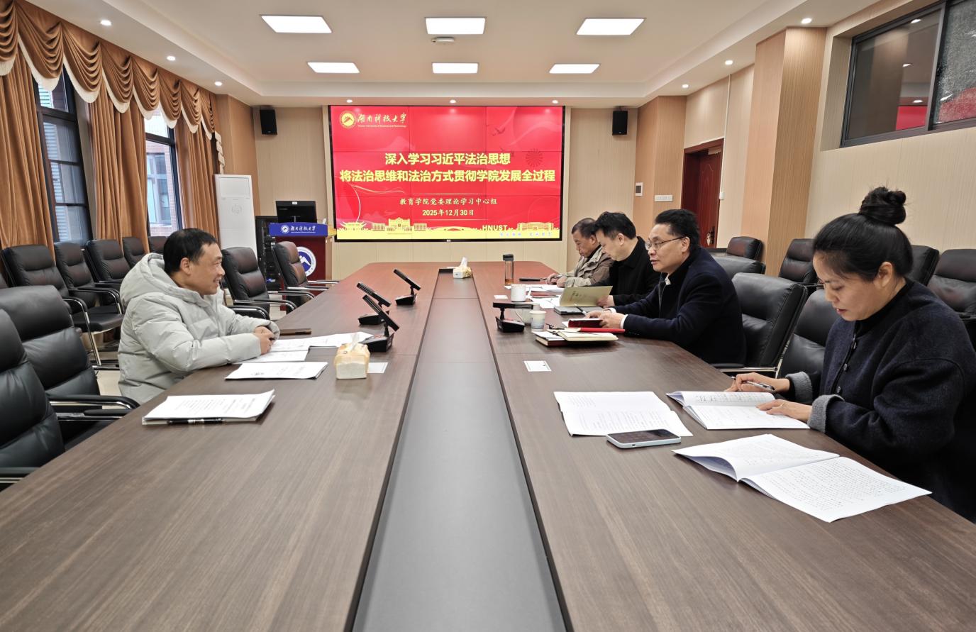 为深刻领会习近平法治思想的核心要义与实践要求,切实将法治思维和法治方式贯穿学院发展全过程,12月30 日,yl88858永利集团党委理论学习中心组在敏行楼A333举行2025年第十二次集体学习。院党委书记傅早霞主持学习,院党委委员、专职组织员参加学习。