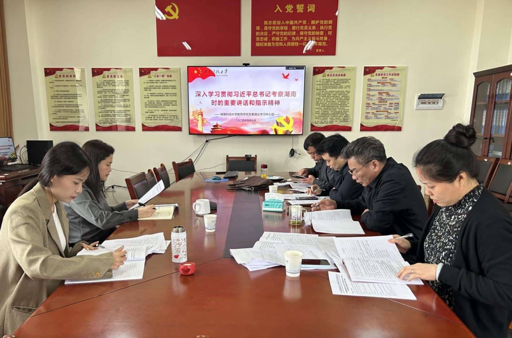 与会人员认真研读习近平总书记在湖南考察时强调 坚持改革创新求真务实 奋力谱写中国式现代化湖南篇章、主持召开新时代推动中部地区崛起座谈会强调 在更高起点上扎实推动中部地区崛起、考察湖南第一师范学院重要讲话精神学习资料以及努力把思政课办得越来越好、省委常委会(扩大)相关会议精神等内容。李炳煌、院党委副书记文红梅领学相关内容。