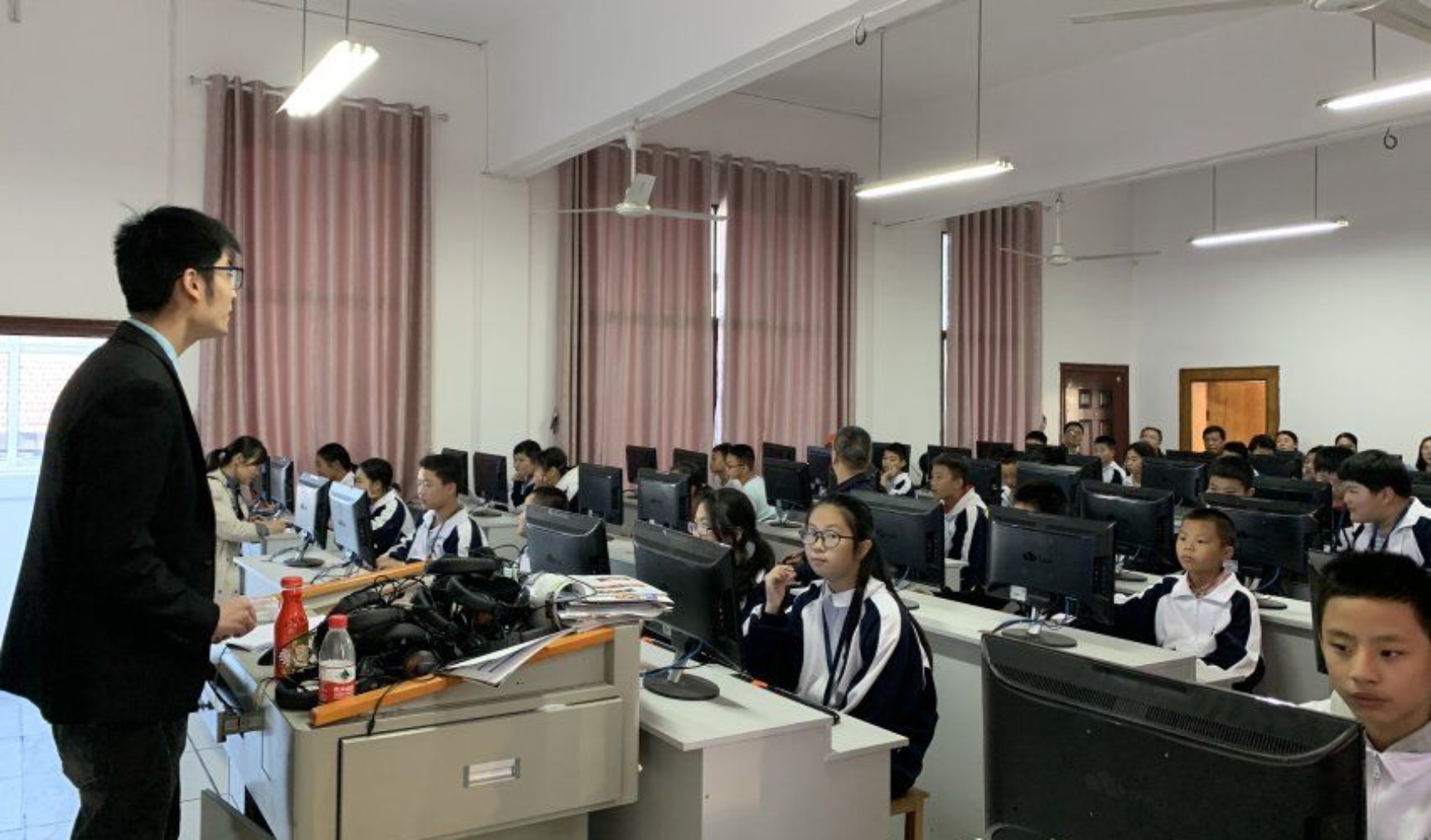 最后,院领导、指导老师和实习生移步到电脑教室,观摩了实习生龚义卿的课堂教学。