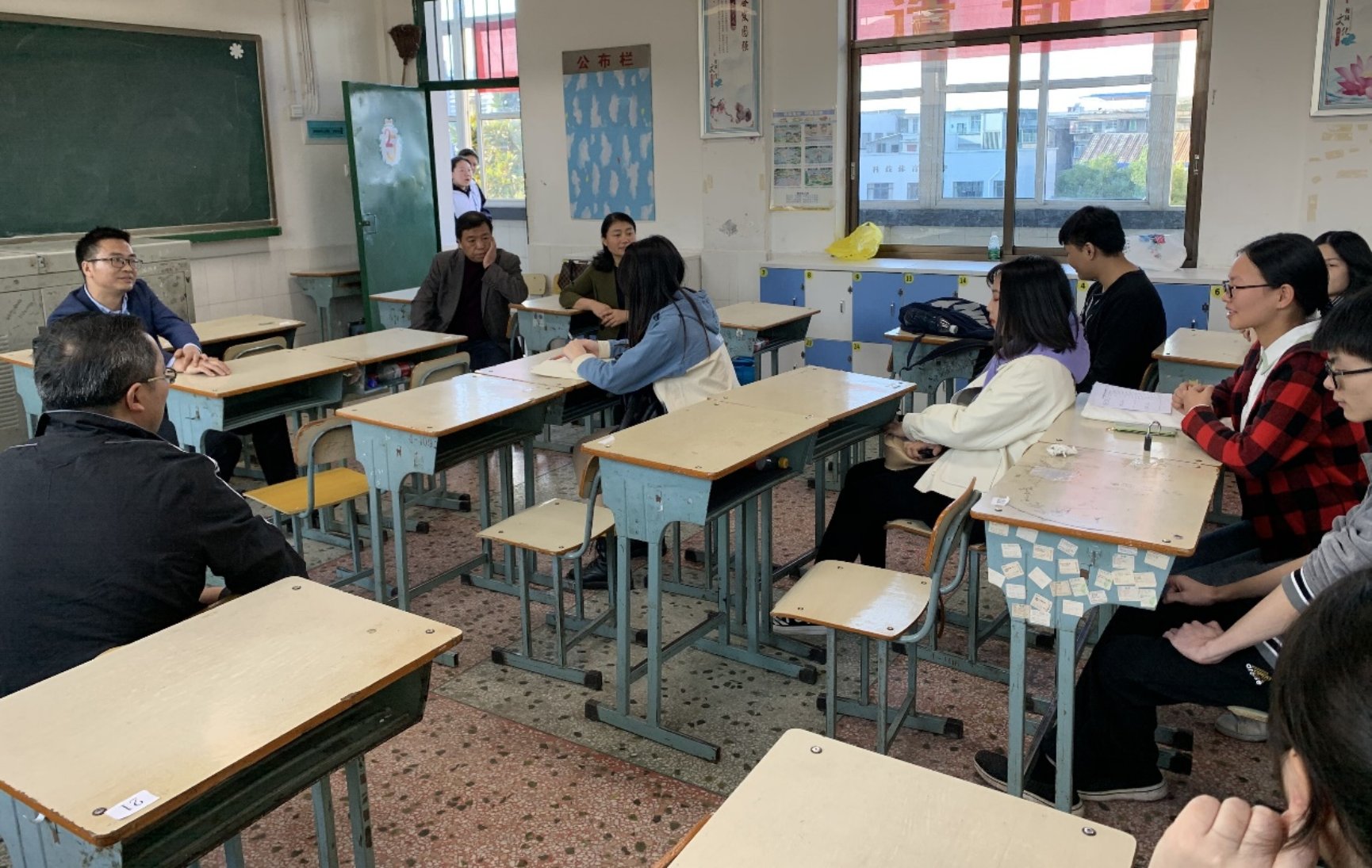 下午4点,实习检查小组到达湘潭市第十一中学,在实习生的备课室进行了短暂、轻松、活跃的实习座谈会。张克敏老师简要介绍了实习生实习情况。十一中教务主任邱波对我院实习工作给予了高度的肯定:同学们逐渐适应“从学生到老师”的角色转换,认真完成实习教学任务,积极配合班主任和指导老师的工作,整体上来说表现很好,希望同学们再接再厉。