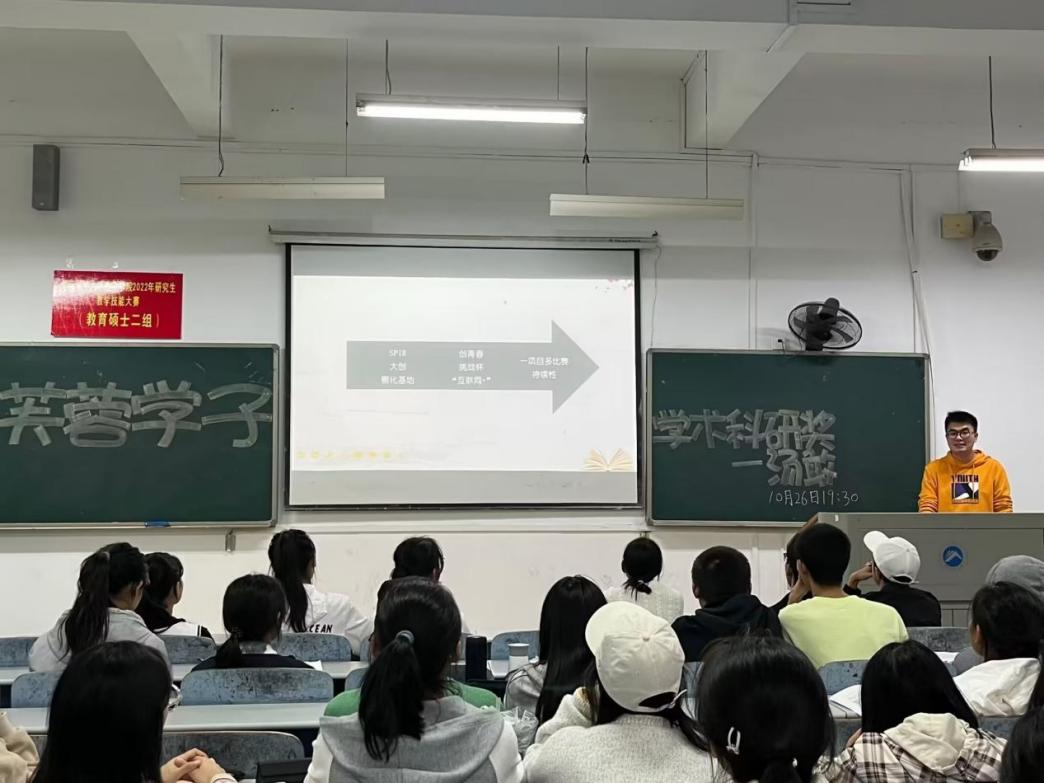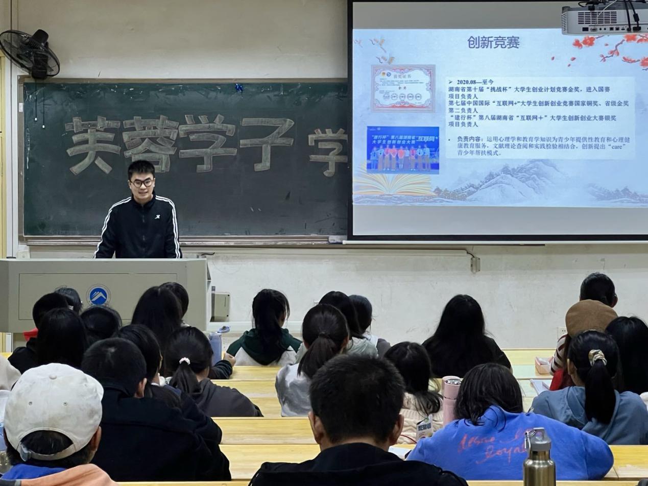 为更好的弘扬榜样力量,营造良好学风,鼓励更多学生投入到学术研究中来,10月27至28日,我院于第八教学楼和第十教学楼东附楼分别召开四场芙蓉学子宣讲会。活动由19级应用心理学二班汤敢主讲,22级全体新生到场聆听。