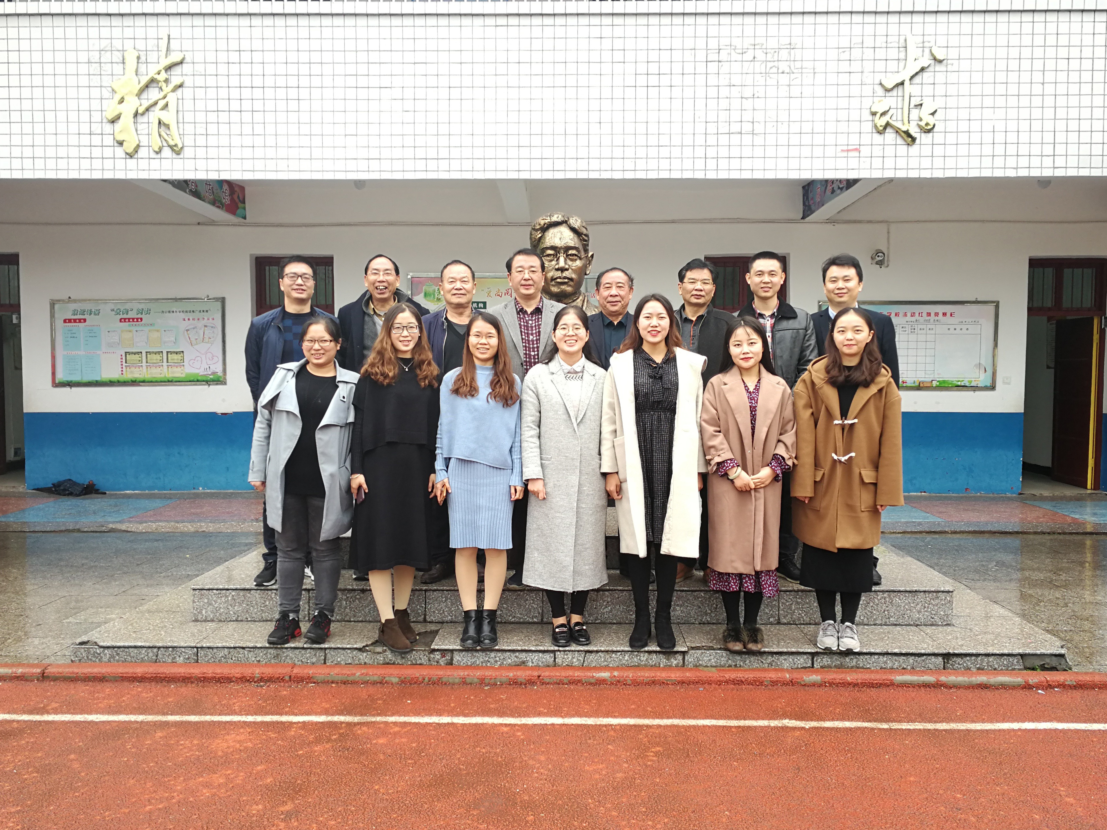最后,学院领导与全体实习生在刘佛年先生的铜像前合影留念。在此实习的同学们对此次领导的视察与看望感到无比的温暖,并决心以过往的实践为基础,以院长和书记的勉励为新的起点,不负所望继续努力,将后续实习工作做得更好,争取扣好教育人生的第一粒扣子,淘得教师生涯的“第一桶金”!