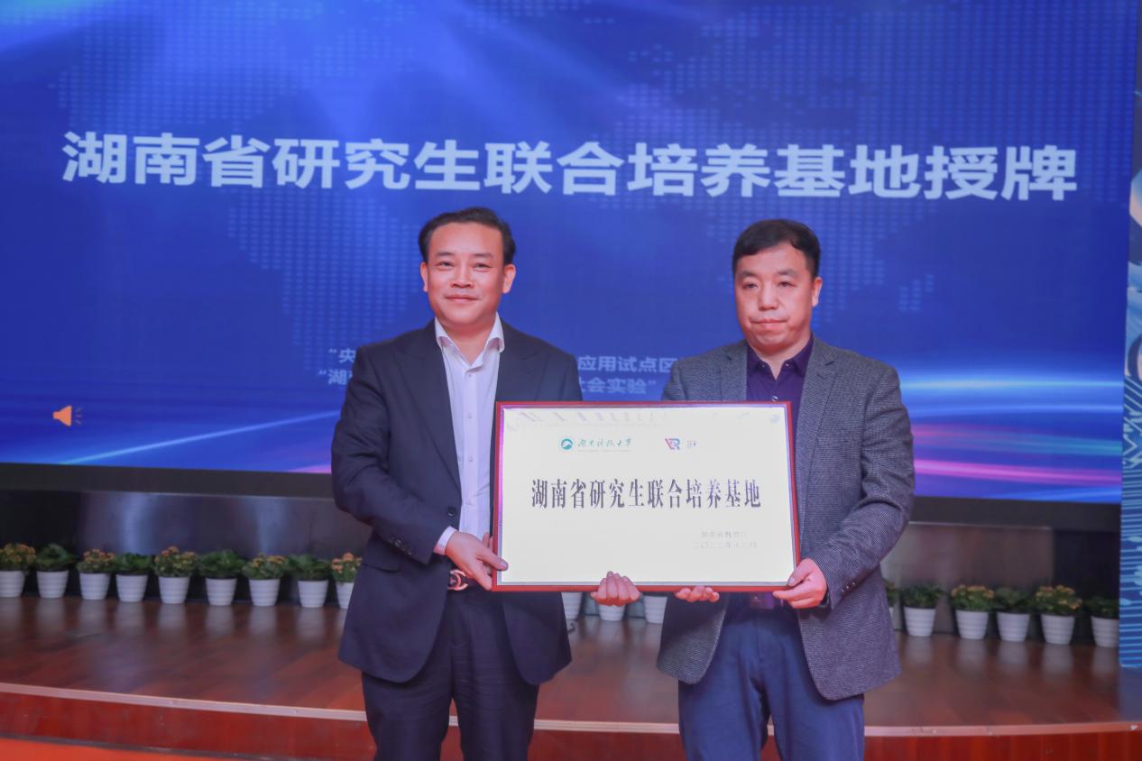 副院长张进良在会上就联合培养研究生、加强校地合作等内容进行了分享交流,他表示将加强与试点区(试点校)的合作,选派研究生参与人工智能教育实践,缓解中小学人工智能教育师资不足等问题,为人工智能教育实践提供人力资源支撑。现场还举行了我校与湖南威阿智能科技有限公司共建的“湖南省研究生联合培养基地”授牌仪式。