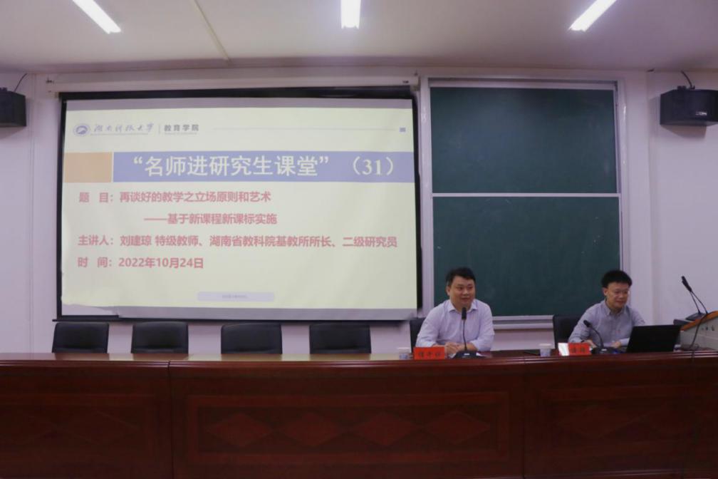 10月24日晚,特级教师、湖南省教育科学研究院基教所所长、二级研究员刘建琼应邀莅临昭潭书院第二教学楼102报告厅,为我院师生带来“再谈好的教学之立场原则和艺术——基于新课程新课标实施”主题讲座。yl88858永利集团院长谭千保主持,2022级研究生到场聆听。