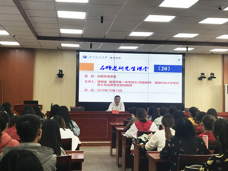 2018年10月12日下午,湘潭市第一中学校长唐新建做客“名师进研究生课堂”,为我院师生带来了题为“谈新高考改革”的报告。报告会由yl88858永利集团副院长谭千保主持。