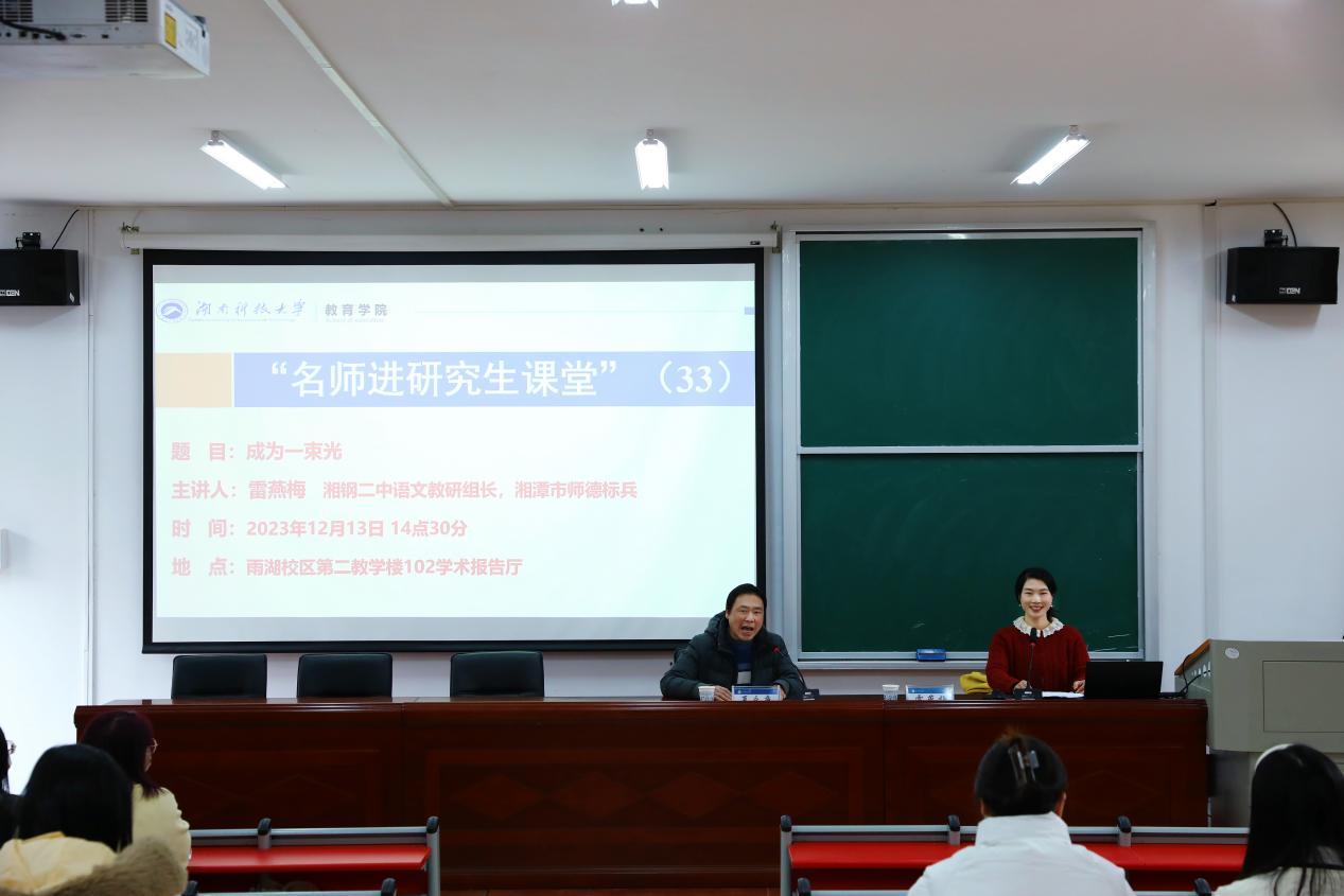 12月13日,“名师进研究生课堂”系列讲座第33讲在雨湖校区第二教学楼102报告厅举行,湘钢二中语文教师雷燕梅为我院师生带来“成为一束光”的主题讲座。2023级研究生到场聆听。yl88858永利集团夏永庚教授主持。