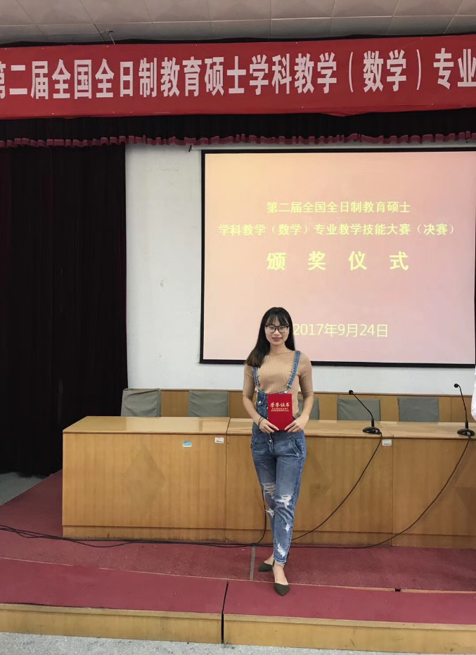 2017年9月22-24日,由全国教育专业学位研究生教育指导委员会与中国高等教育学会教师教育分会数学教师教育专业委员会共同主办的第二届全国全日制教育硕士学科教学(数学)专业教学技能大赛(决赛)在鲁东大学举行。我院2016级学科教学(数学)专业研究生朱潘婷同学荣获决赛二等奖,指导教师袁梓瀚老师获“优秀指导教师”奖。