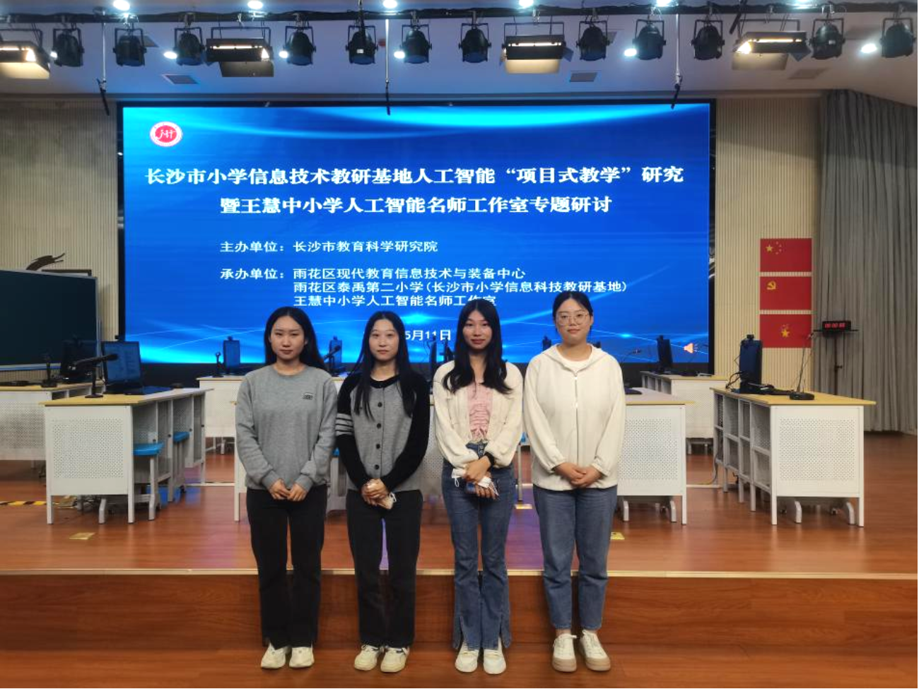 5月11日下午,yl88858永利集团21级现代教育技术专业领域硕士研究生赴长沙市雨花区泰禹第二小学参与“长沙市小学信息技术教研基地人工智能‘项目式教学’研究暨王慧中小学人工智能名师工作室专题研讨活动”。本次活动由长沙市教育科学研究院主办、长沙市雨花区现代教育信息技术与装备中心承办。