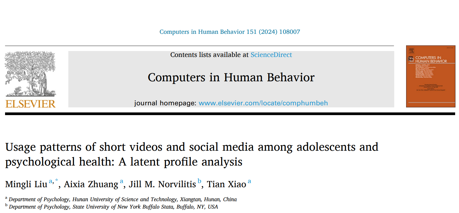 近日,我院心理学系教师刘明理等在《Computers in Human Behavior》上发表论文,论文题目为“Usage patterns of short videos and social media among adolescents and psychological health:A latent profile analysis”。该期刊由PERGAMON-ELSEVIER SCIENCE LTD出版社出版,是一本国际权威期刊,属于中科院SCI一区、JCR SSCI Q1区。根据最新数据,该期刊2023年的影响因子为9,CiteScore指数值为19.1。