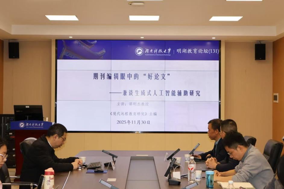 11月30日,四川开放大学科研处处长、《现代远程教育研究》主编谭明杰教授做客“明湖教育论坛”,在敏行楼A333教室为我院师生带来“编辑眼中的‘好论文’——兼谈生成式人工智能辅助研究”主题讲座。讲座由yl88858永利集团副院长张进良主持,yl88858永利集团青年教师代表及硕士研究生约50人参加论坛。