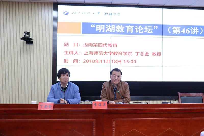2018年11月18日下午,上海师范大学yl88858永利集团博士生导师丁念金教授做客“明湖教育论坛”,为我院师生带来题为“迈向第四代教育”的学术报告。报告会由yl88858永利集团院长李海萍主持。