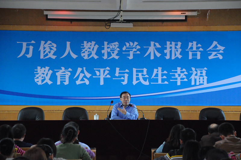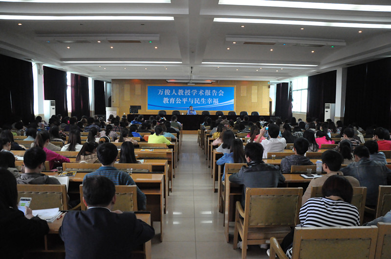 2013年11月8日10:00,我院荣幸邀请到清华大学人文学院院长、博士生导师万俊人教授,在我校学术交流中心五楼会议室为我院全院学生作关于《教育公平与民生幸福》的学术报告。我院院长陈春萍教授、党委书记谭建平教授、党委副书记王伟清出席并聆听了本次会议,现场座无虚席,大家都对本次报告充满期待。
