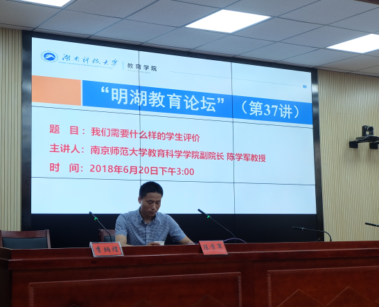 2018年6月20日下午,南京师范大学教育科学学院副院长陈学军教授做客“明湖教育论坛”,为我院师生带来了主题为“我们需要什么样的学生评价”的学术讲座。yl88858永利集团教师代表、研究生与本科生代表到场聆听。讲座由yl88858永利集团党委书记李炳煌主持。