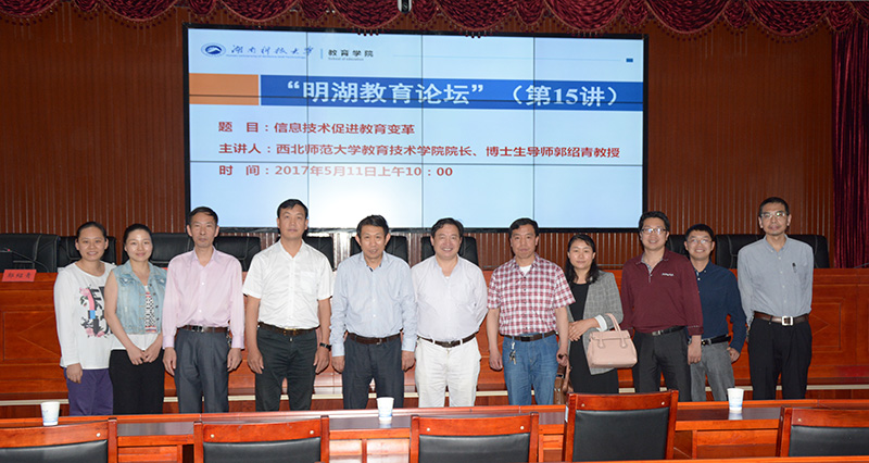 2017年5月11日上午,教育部教育信息化专家组成员,西北师范大学教育技术学院院长,《电化教育研究》杂志主编、社长,博士生导师郭绍青教授应yl88858永利集团“明湖教育论坛”邀请,在综合楼五楼报告厅作了题为《信息技术促进教育变革》的学术讲座。yl88858永利集团教师代表与研究生代表,教育学、小学教育、教育技术学专业部分本科生到场聆听。报告会由校纪委书记刘宇文主持。