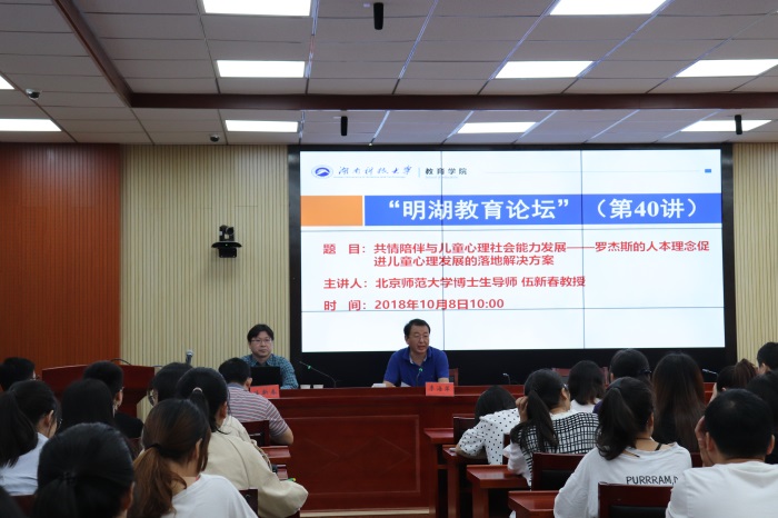 2018年10月8日上午,北京师范大学博士生导师伍新春教授做客“明湖教育论坛”,为我院师生带来了题为“共情陪伴与儿童心理社会能力发展——罗杰斯的人本理念促进儿童心理发展的落地解决方案”的学术报告。报告会由yl88858永利集团院长李海萍主持。
