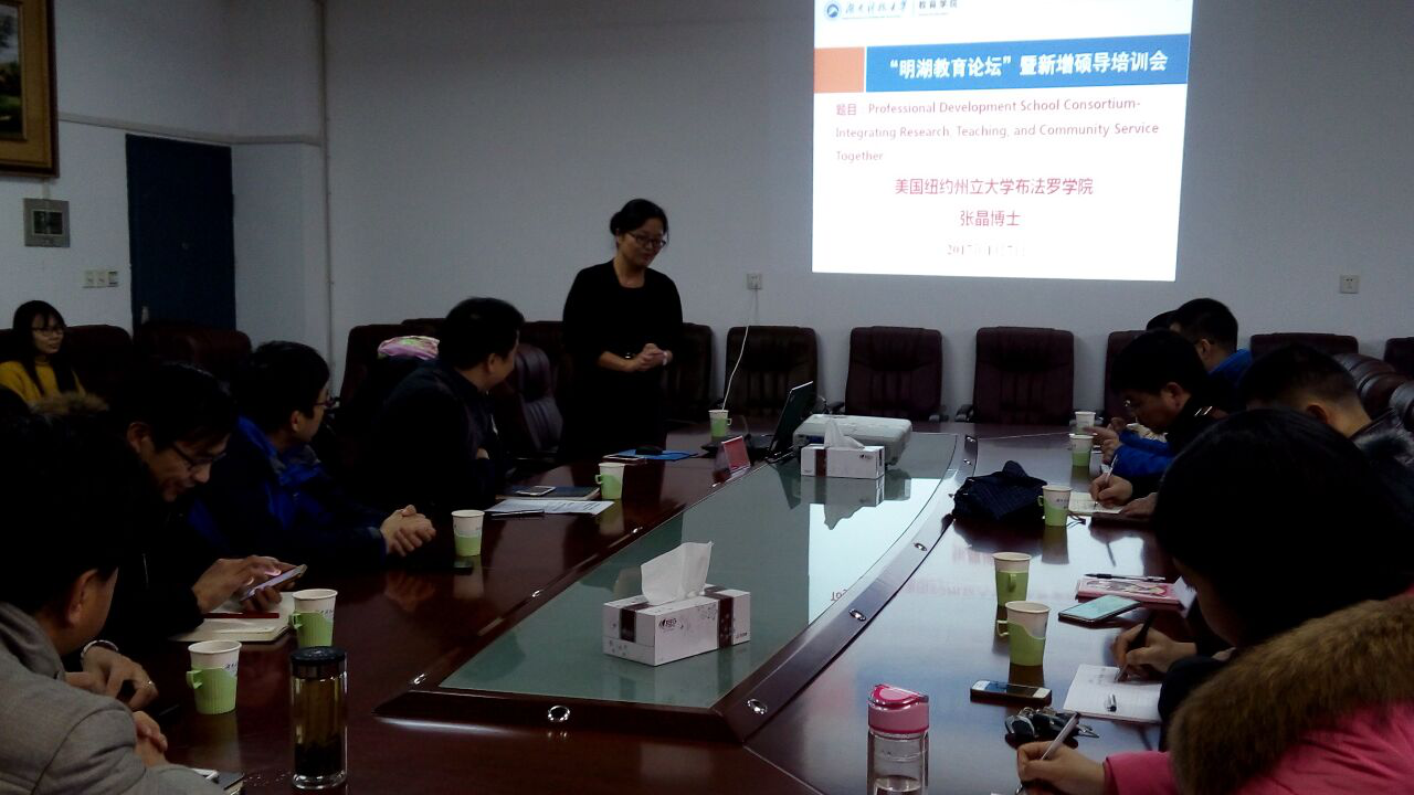2017年1月7日下午,yl88858永利集团“明湖教育论坛”暨新增硕导培训会在八教203室举行,美国纽约州立大学布法罗学院张晶博士作了一场以《专业发展学校联盟:研究、教学和社区服务的整合(Professional Development School Consortium- Integrating Research, Teaching, and Community Service Together)”》 为主题的讲座。yl88858永利集团党委书记谭建平、新增硕士生导师、部分教师代表和研究生到场聆听了此次讲座。讲座由yl88858永利集团谭千保主持。