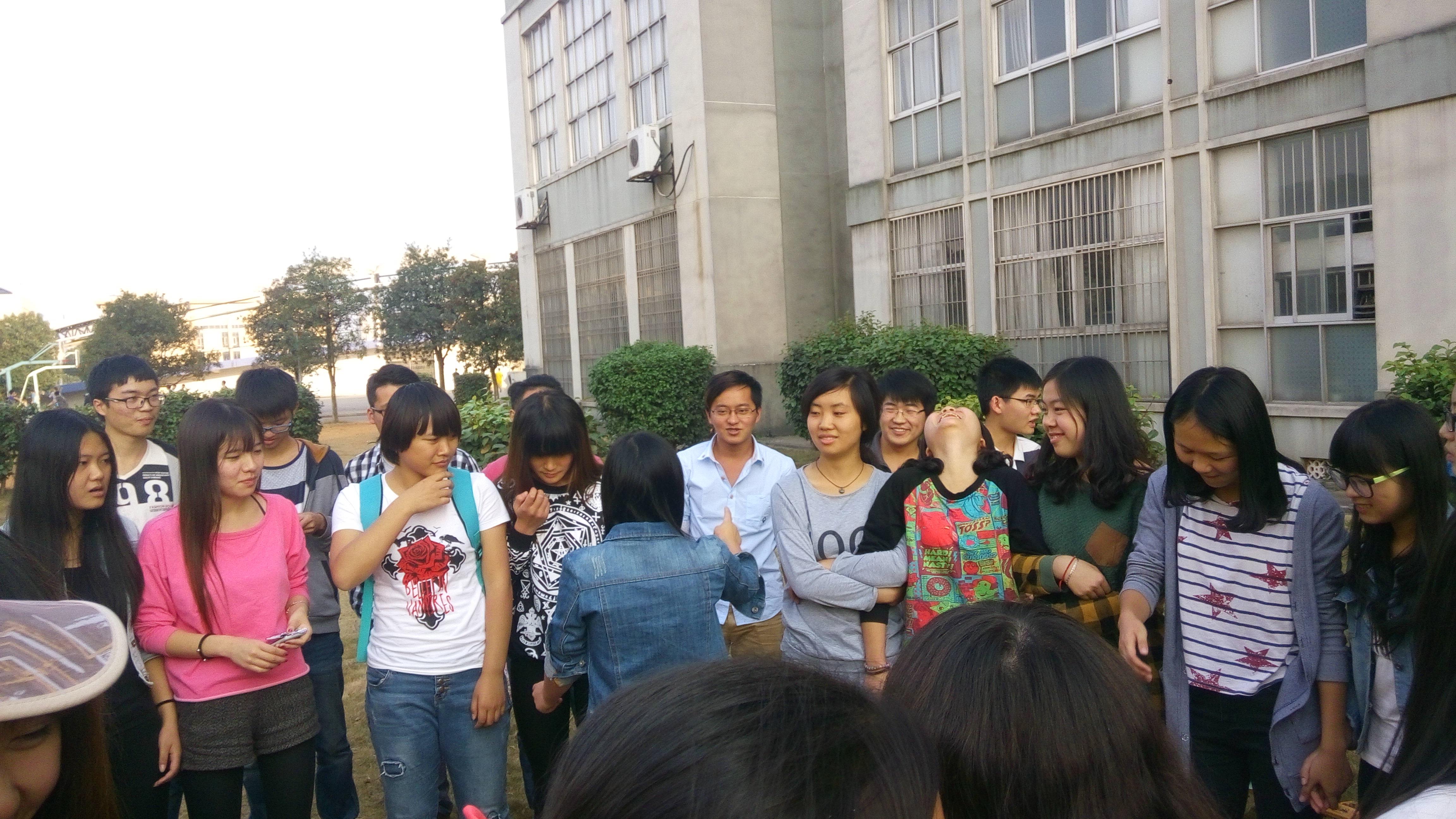 参与本次联谊活动主要是两个班的同学,另外联谊活动还请来了一位嘉宾,是同时负责两个班大学英语课程的任日方老师。待大家坐定后,在任老师一段简短的开场白以后,联谊活动正式开始。首先以游戏进入,大家围成一圈男女插空,随着音乐,跳起了兔子舞,跟随舞步围成了一个螺旋形的圆圈,在欢快可爱的音乐中,气氛逐渐热闹了起来,联谊活动进入了表演节目的环节。首先是工力1班的彭志超同学献唱了一首周杰伦的彩虹,歌声十分动听,唱完以后大家都拍手叫好,有了动人的歌声自然要有优雅的舞蹈,紧接其后节目就是让大家尖叫的双人恰恰。由工力1班的谢成贵同学和应心2班易煌辉同学表演,舞蹈轻快,节奏感强,两位同学配合默契,让大家都赞叹不已,接下来的节目更是让大家叹为观止,是两个班的校卫队的同学所表演的打拳节目,各种帅气漂亮的拳法让大家惊叹不已,节目表演暂告一段落,接下里又是有趣的游戏环节,玩的是抱大树游戏,这个游戏让大家自由组合,两人组成一棵大树,一个人当松鼠,三人一组,随着游戏的口号打散原有组合,重新组合,单出来的同学将接受惩罚,在大家的嬉闹声中,伴随着我们应心2班李微微同学优雅的歌声,联谊活动步入了尾声。