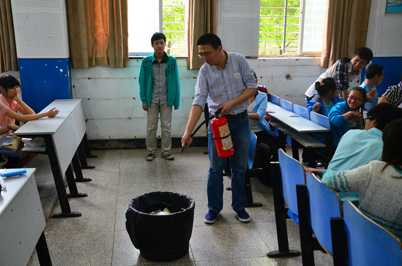 大会开始前,李老师为所有学生演示了怎么安全使用灭火器。演示完毕后,李老师提醒同学们灭火器只能用于扑灭小火,遇到大型火灾,还是尽快逃生,并拨打消防电话。
