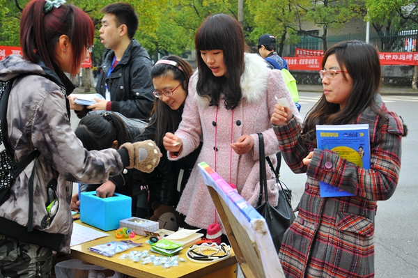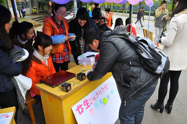 由我院第十五届团委学生会精心制作的视频在课堂间隔的10分钟播放,男生们真诚的寄语,李涛老师幽默风趣的“星星”祝福语,学生会成员真心的表演,都轻轻地走进了大家的心坎里。在采访中,来自13级应心2班的谭敏同学说:“最后那个熊猫和QQ宠物的对话最有趣了!真的感受到了那中暖暖的感觉。”目光投向电信路口,没错,那就是yl88858永利集团团委女生活动部精心策划实施的“女生,我想对你说”、“女生心愿男生帮”等活动也在倾情进行。粉色蓝色的气球装饰着少女的心,不仅有男生自愿抽取3月6日晚下寝收来的愿望卡去实现幸运女神的愿望,还有很多人激动地参与有奖竞猜。令人惊讶的是电视台的主持人和记者来采访了这次活动的经过。我们看到的比这雨天的水更多的是学生们的幸福笑容。晚上还有“星使”下寝送贺卡,给教育女神们睡前的感动。