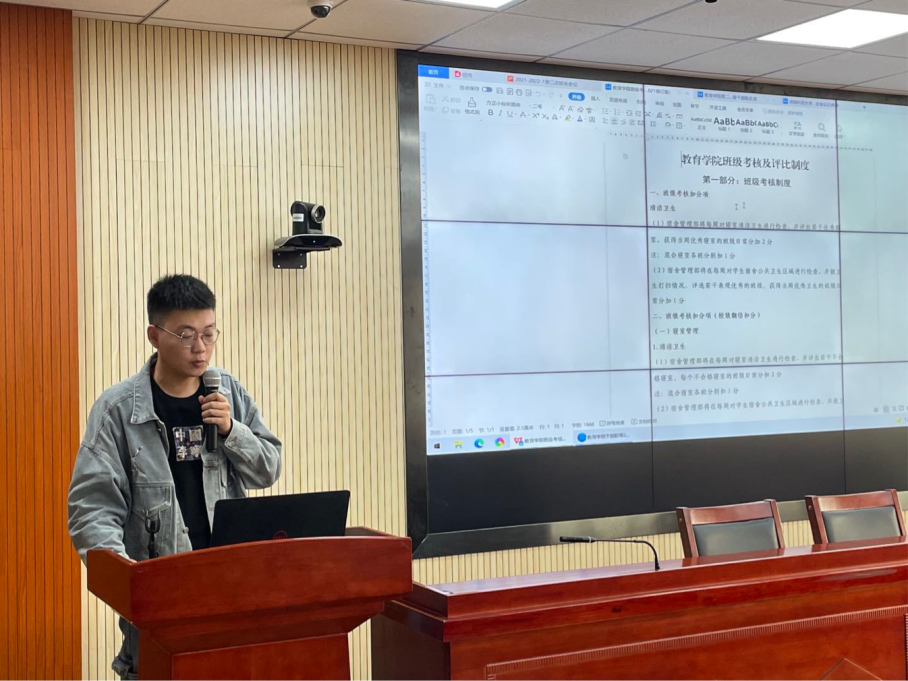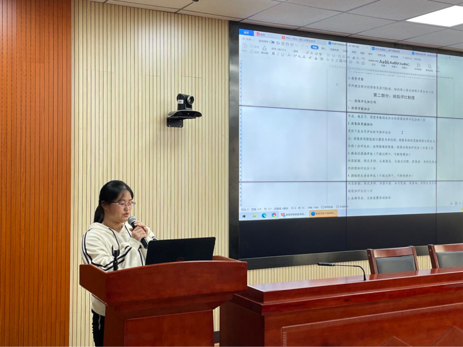 随后,综合办公室副主任孙学瑶从宿舍、早读晚自习、课堂考勤、卫生及班会的会议记录表和班委干部联系表这四个方面详细地讲解了yl88858永利集团班级考核制度。接着,他介绍了宿舍扣分细则以及缺勤,卫生不合格会带来的影响。此外,孙学瑶重点强调了班会的会议记录表与班委干部联系表的格式与字体要求,他表示不要随意更改文件格式,并且在提交文件时需要按照格式进行重名命,最后他提醒各班班长一定要及时按标准提交文件。