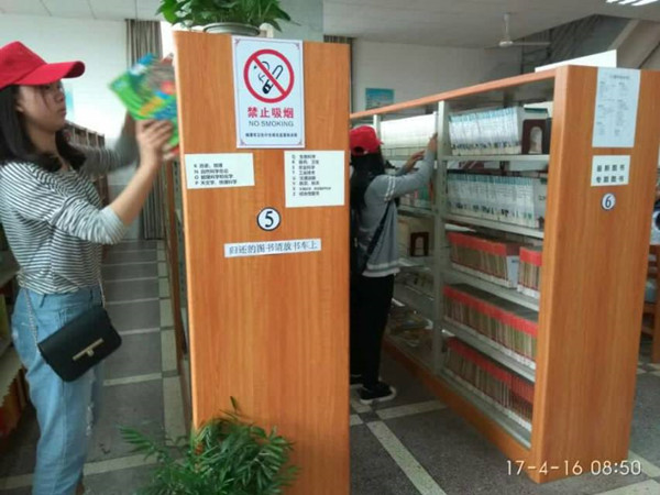 湘潭市少儿图书馆的工作结束后,小队长带领6名志愿者前往湘潭市图书馆继续完成这次志愿活动。虽然**书馆的工作量不大,但志愿者们仍然以积极的状态投入到工作中。将原本有些凌乱的纾解全都分门别类整理好。不知不觉,图书整理志愿活动接近尾声。三个小时的活动时间很短,可这三个小时带给大家的正能量却让人受益终生。志愿者们知道了秩序管理的难度,在深切地了解管理工作艰辛的同时,同学们图书馆主人翁意识也得到大大提高。