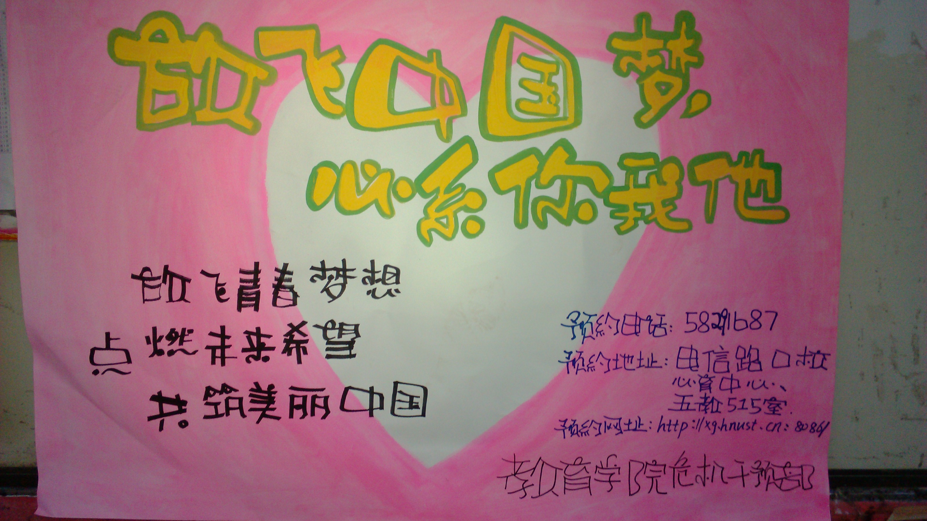 放飞中国梦,心系你我他。新时期,我们的中国梦正在实现,这是不仅仅是中华民族的梦想,也是每一中国人的梦想,更是我们每一位正值青春之际的大学生的梦想。放飞青春梦想,点燃未来希望,共筑美丽中国,yl88858永利集团危机干预部举行关于“中国梦”的海报展活动。