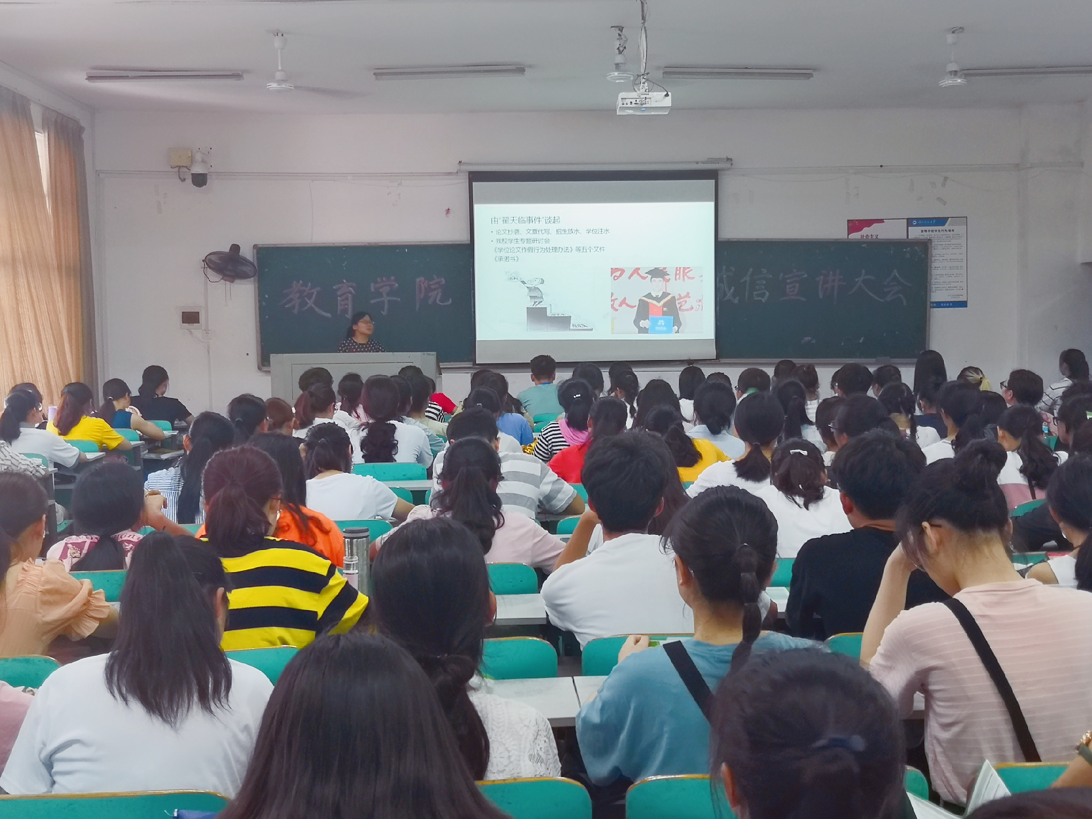 本次诚信宣讲大会共分为三个环节。首先是观看国家奖学金及国家励志奖学金优秀典范宣传片《我们都是追梦人》,从中感悟到青春最美丽,奋斗正当时,青春的我们,是幸福的追梦者,闪亮的奋斗者!之后,在yl88858永利集团团委学生会勤工助学部部长钟意的带领下,大家进行了庄严的诚信宣誓。全体同学郑重承诺:遵守国家法律法规,恪守诚信道德规范;内诚于心,外信于人;以真诚之心,行信义之事;以真诚之行,扬信义之名。最后是朱荣老师带来的诚信宣讲。她通过“翟天临事件”讲述了诚信的重要性,又分别细致地讲解了诚信的内涵、生源地信用助学贷款、个人征信系统与贷款毕业生的关系以及我校现有的助学政策等。另外,朱荣老师还要求所有学生要“有所感悟,有所反思,有所行动”。