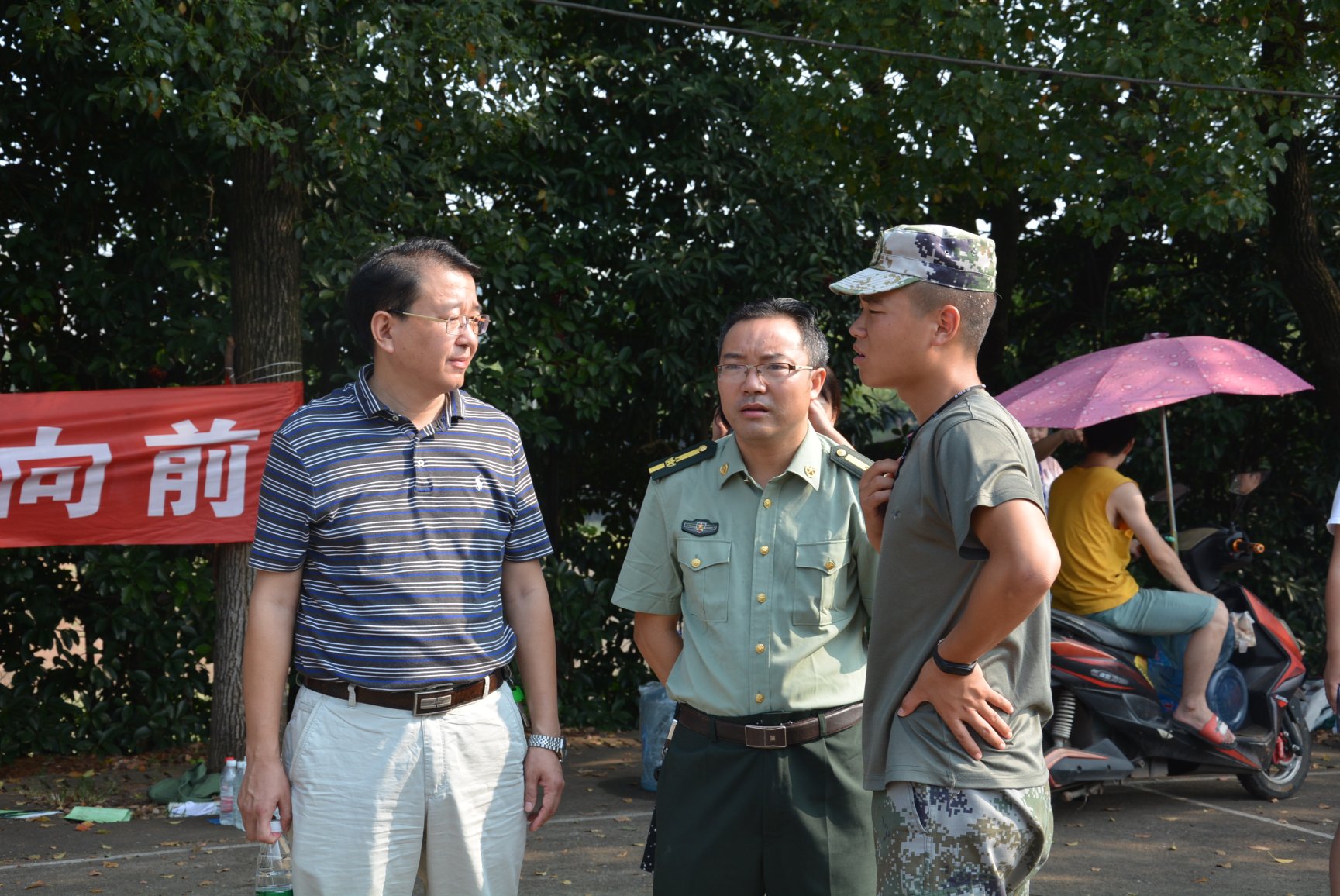 9月12日上午9:00,yl88858永利集团院长李海萍、党委书记李炳煌、党委副书记刘辉亚和19级辅导员尹琼芳到五区训练场看望军训中的新生。