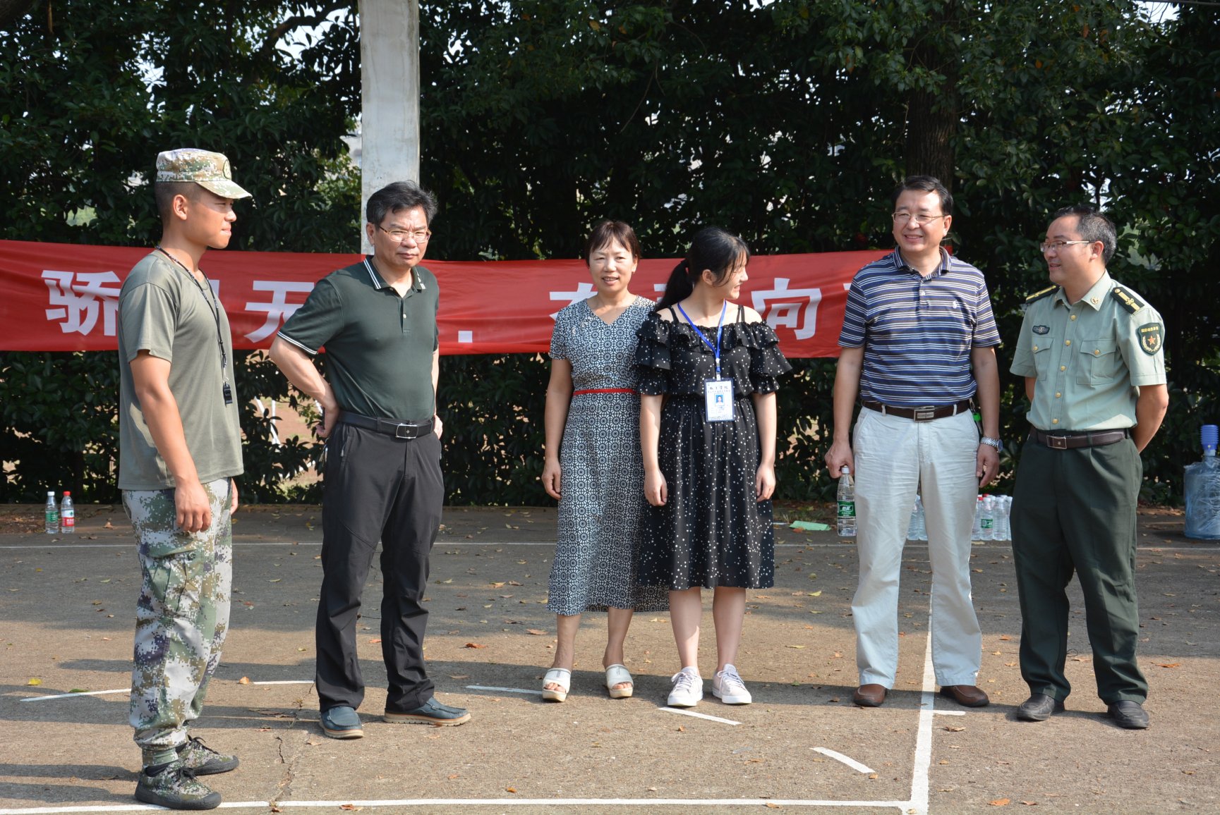 营长盛万玉向学院领导介绍军训方阵队、各个排的训练情况和训练效果。学院领导们对前段军训成效寄予高度评价,希望大家好好训练,练出实效,练出成绩;感谢教官们不畏炎热的辛勤付出;深切慰问因军训不适随训的学生,叮嘱他们要照顾好自己的身体,同时赞许了他们在随训中仍不忘学习的精神。随后,领导们走向各个排,仔细视察各个排的训练并为他们拍照留念。在与现场学生干部的沟通中,强调内务整理一定要注意安全,后勤服务要细致周到,同时叮嘱大家也要注意防暑和交通安全。
