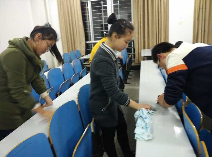 清除桌面涂鸦,创造良好课堂环境。2015年11月14日星期六晚,yl88858永利集团青年志愿团在第八教学楼开展清理教室志愿活动。