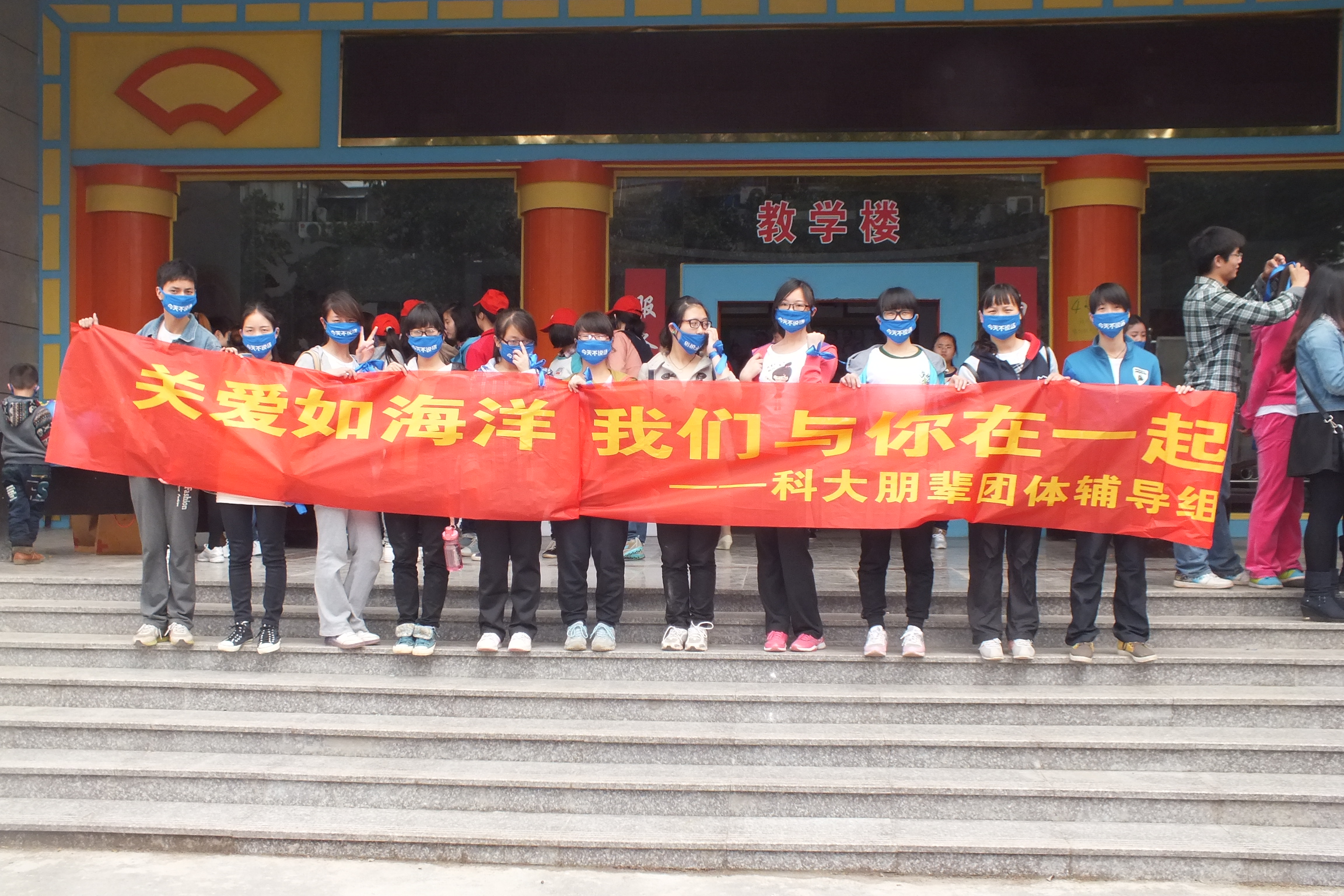 “4.2,我们的节日,请为我们系上蓝丝带。”现场犹如蓝色的海洋,每个人都系着蓝丝带,带着蓝口罩。志愿者们有条不紊地维持现场秩序,组织签到、入场。