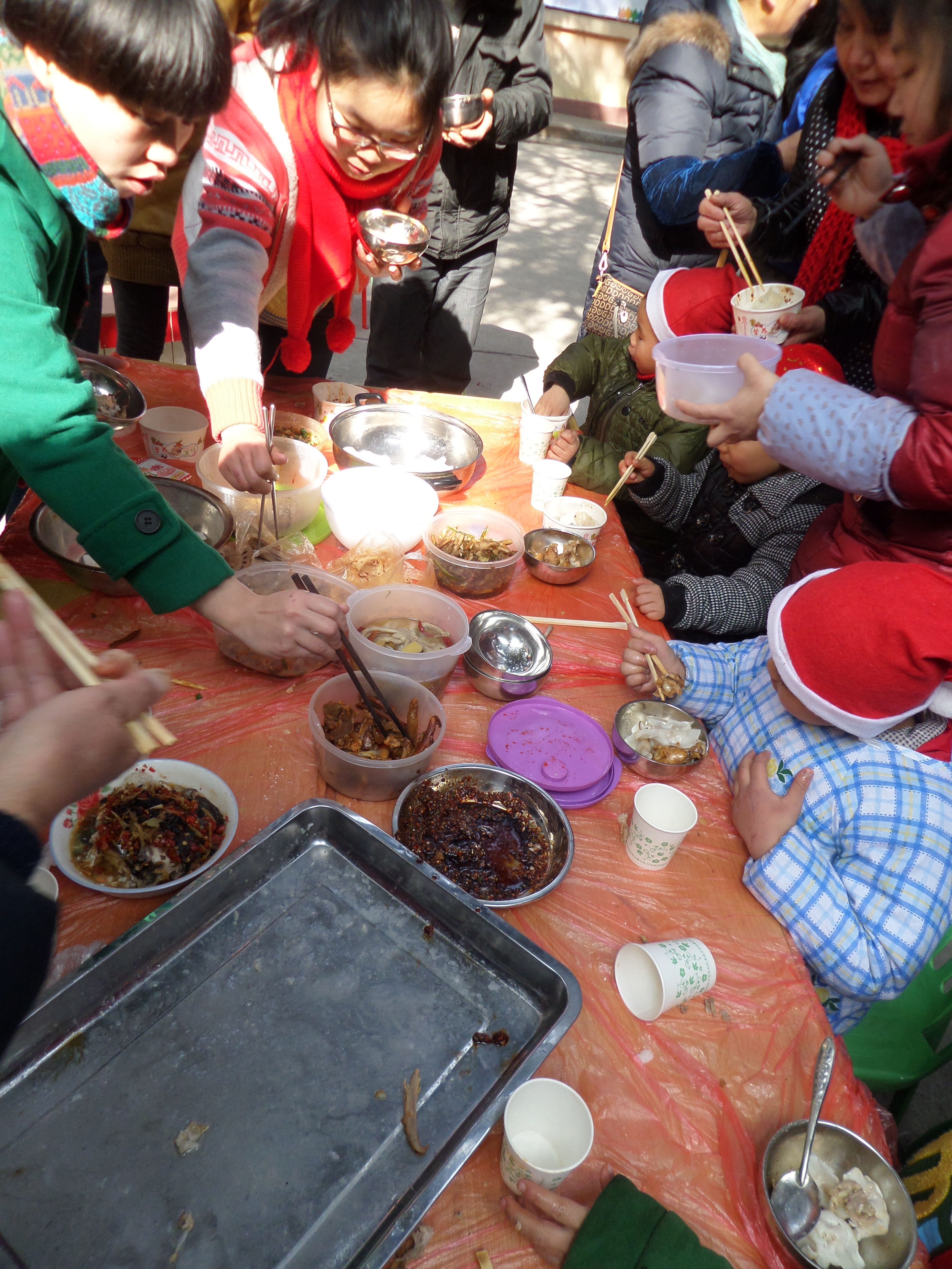 联欢开始后,志愿者、家长和孩子们围坐在一起,观看着各种精彩的表演,可爱的童音独唱《彩虹的约定》,孩子们头戴圣诞帽,跳起欢快的舞蹈。识字卡、彩笔、蜡笔、橡皮泥等小礼物在志愿们合唱的《幸福拍手歌》中,纷纷落入孩子们的手中……在年末联欢之后是丰盛的大餐,饺子以及各式的配菜摆满了桌子,家长、孩子和志愿者们围在桌子旁,共同享受着充满节日喜悦的午餐。