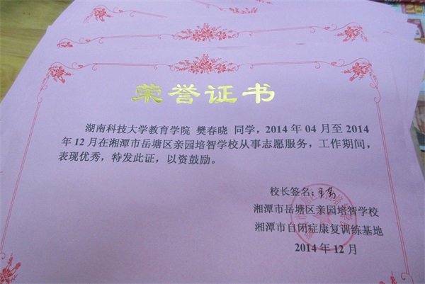图为自闭症学校校长为志愿者颁发的奖状
