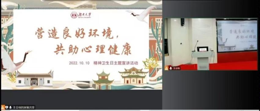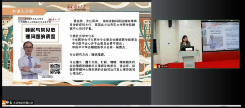 为了更好地迎接世界精神卫生日、宣传心理健康知识、缓解在疫情下大学生的焦虑症状,10月10日,湖南大学心理健康教育中心、湖南科技大学心理健康教育中心、湖南警察学院心理健康咨询中心邀请到了湖南省脑科医院睡眠障碍及精神症主任曾宪祥主任进行宣讲活动,我院组织学生进行线上观看。
