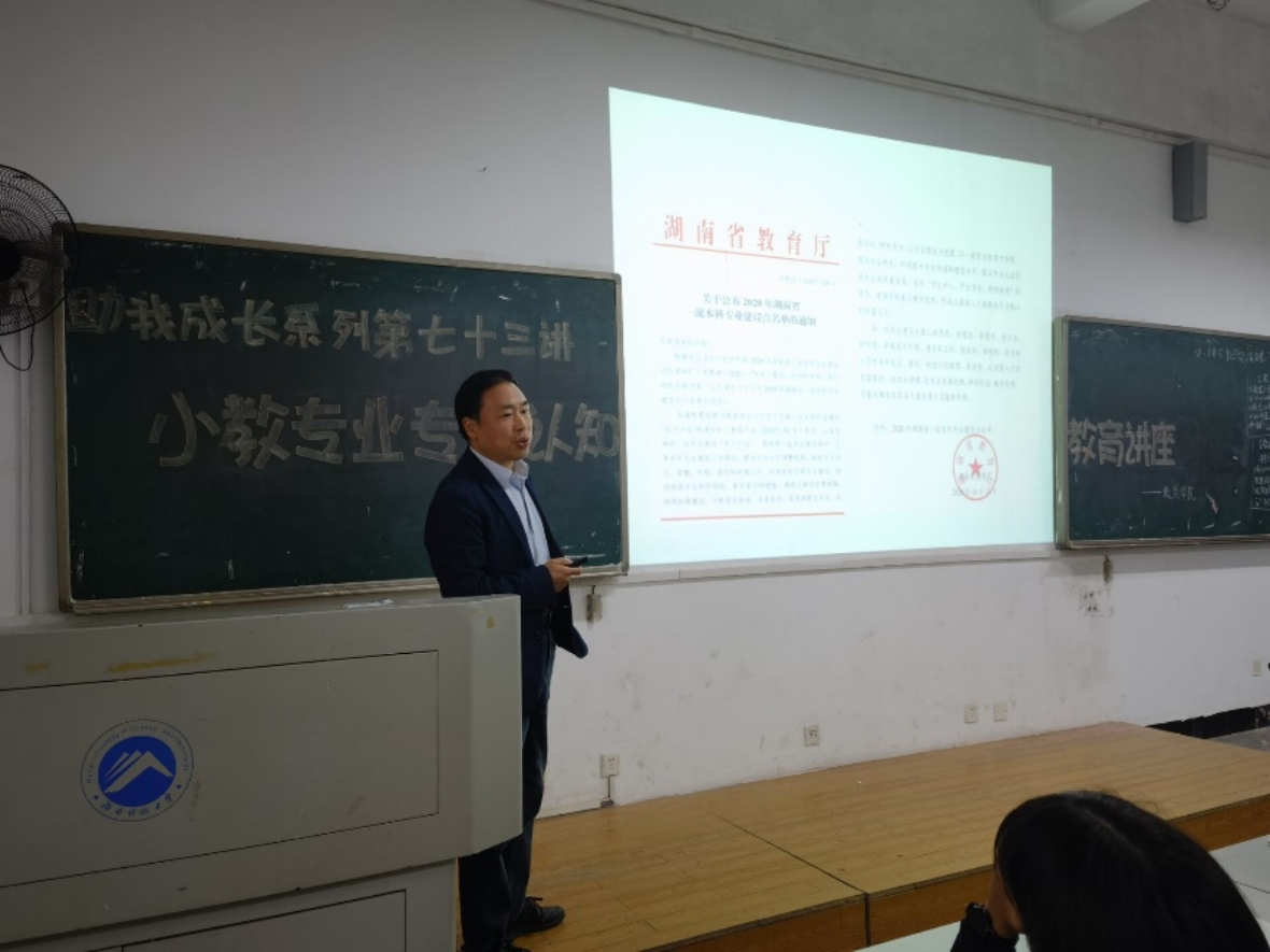 会议伊始,夏永庚首先根据时间顺序为同学们简单展示了小学教育专业的基本情况,让同学们对小学教育专业有个初步的了解。紧接着,他结合湖南省教育厅最新发布的资料耐心地为同学们分析新时代下同学们的形势和未来。随后,夏永庚详细说明了同学们在今后的实践教学中可能会出现的一些具体状况。他表示,同学们之后不论在学习上遇到什么样的困难和问题,都可以向老师或学长学姐们请教。最后夏永庚列举了几名我校小学教育专业毕业的学长学姐,通过讲述他们的优秀事例,让同学们感受榜样的力量并为之不断努力奋斗。