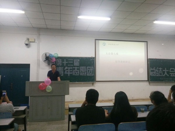 大会的最后由李涛老师做最后的总结发言。他和大家了分享志愿服务的相关感受,也向大家提了几个问题,如进入志愿团的初心是什么,在志愿团一年里奉献了什么,最后离开又收获了什么?为此他概括出了志愿团精神的八字含义:奉献、有爱、互助、进步。“当你把爱带给他人的时候你就已经收获了一天的好心情,而别人的一个微笑或一句感谢于你而言已是一笔财富。同时大家要善于通过志愿活动获得自身的提高,从各方各面学习,而社会就是最好的学习的地方,志愿活动也是一种学习的途径,它教会了你怎样和他人相处,怎样和大家沟通。”确实我们在做志愿的过程中不断的成熟懂事,在志愿的路上一步一脚印,直至遇见了青春里最好的你我他。