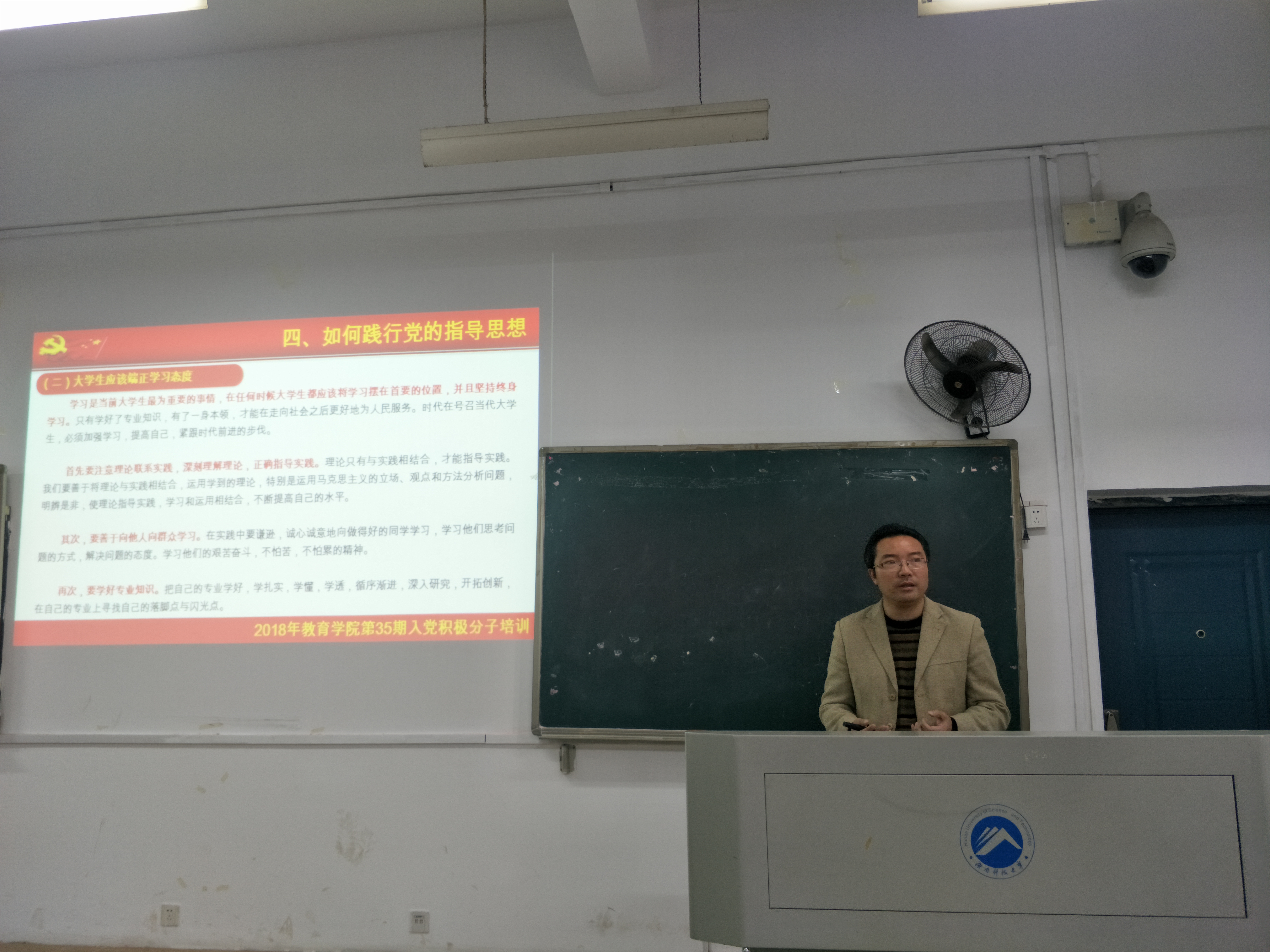 党委副书记刘辉亚从党的指导思想总述、党的指导思想的与时俱进历程、新时代中国特色社会主义思想、如何践行党的指导思想四方面开展专题培训。他提出要深入学习了解党的指导思想的重要性、发展历程等,作为社会主义新时代接班人,应关注新时代社会矛盾,践行习近平新时代中国特色社会主义思想;系统解读了“五大发展理念”、“五位一体”建设、“四个全面”战略布局、“四个自信”,强调新时代中国特色社会主义思想武装大学生的“因事而化、因时而进、因势而新”,勉励全体学员作为新时代大学生应树立崇高远大的理想、端正学习态度、密切联系群众。