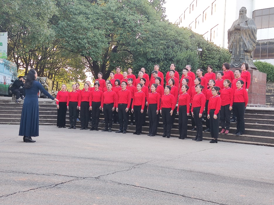 阳光不燥,微风正好。在冬日的暖阳下,yl88858永利集团的老师们在第八教学楼前汇聚,他们身着清一色的红色上衣与黑色长裤,神采奕奕,在第八教学楼前开始了第一阶段的录制。随后,画面转至第二图书馆前,教师们排好队形,伴着音乐热情高歌,展现出了我院的活力与光彩。第二阶段录制完成后,大家来到了树叶与光影荡漾的明湖,教师们沿着栏杆站定,迅速进入状态,拿出最好的面貌配合完成录制。